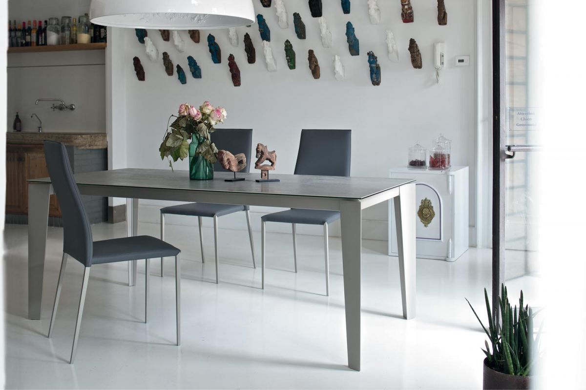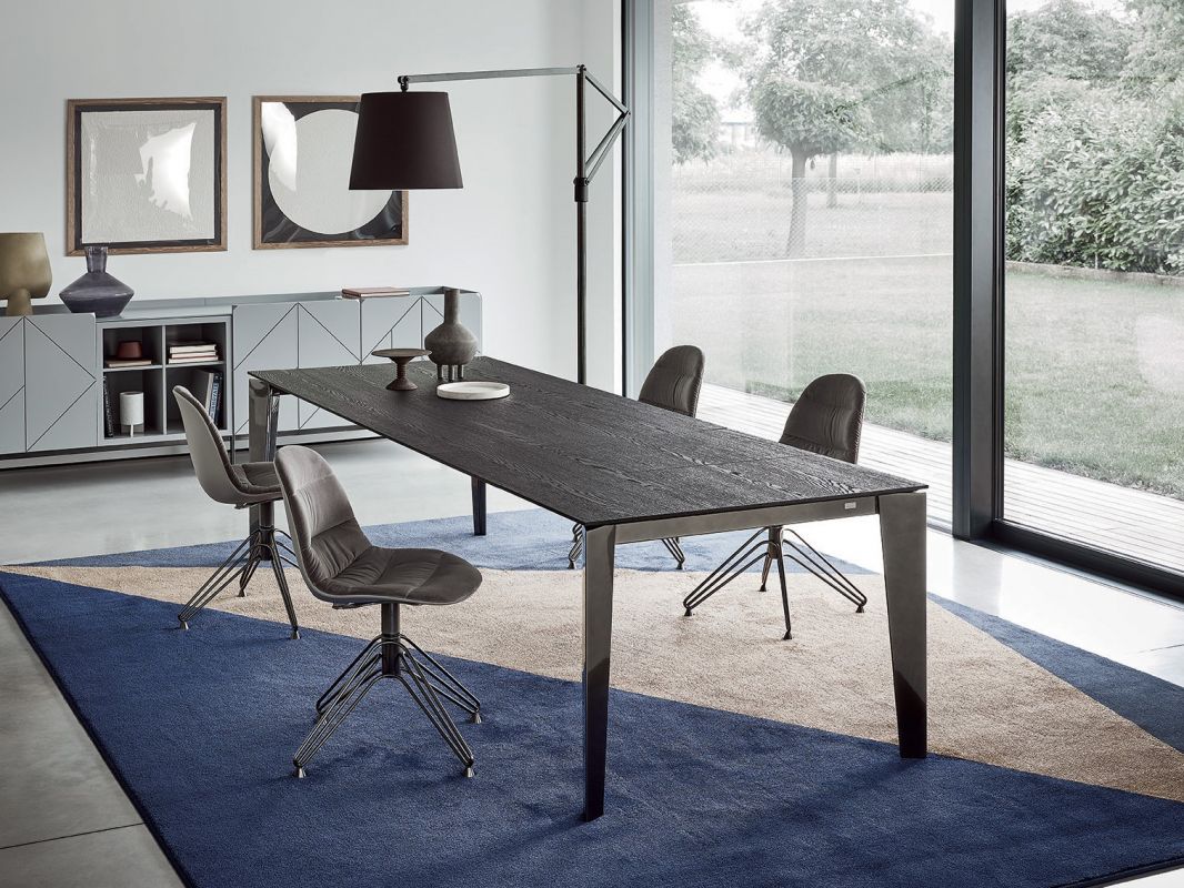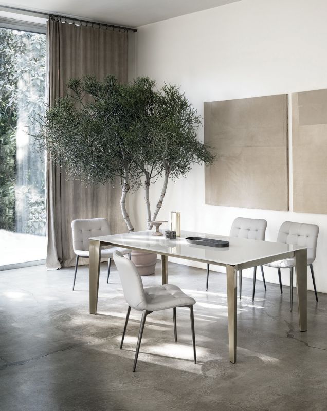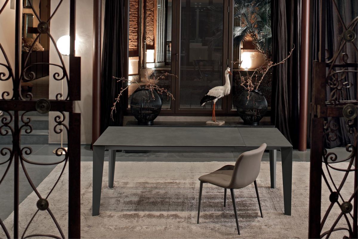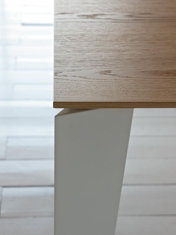 Table with extensions and lacquered Metal frame. Top in melamine, laminate Fenix, Anti-scratch Unicolor, veneer, glossy Glass, velvet matt Anti-scratch Glass, SuperCeramic or SuperMarble