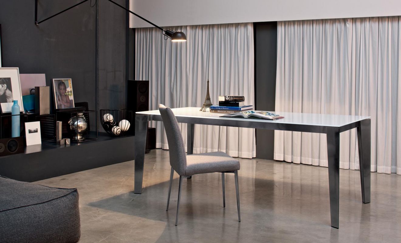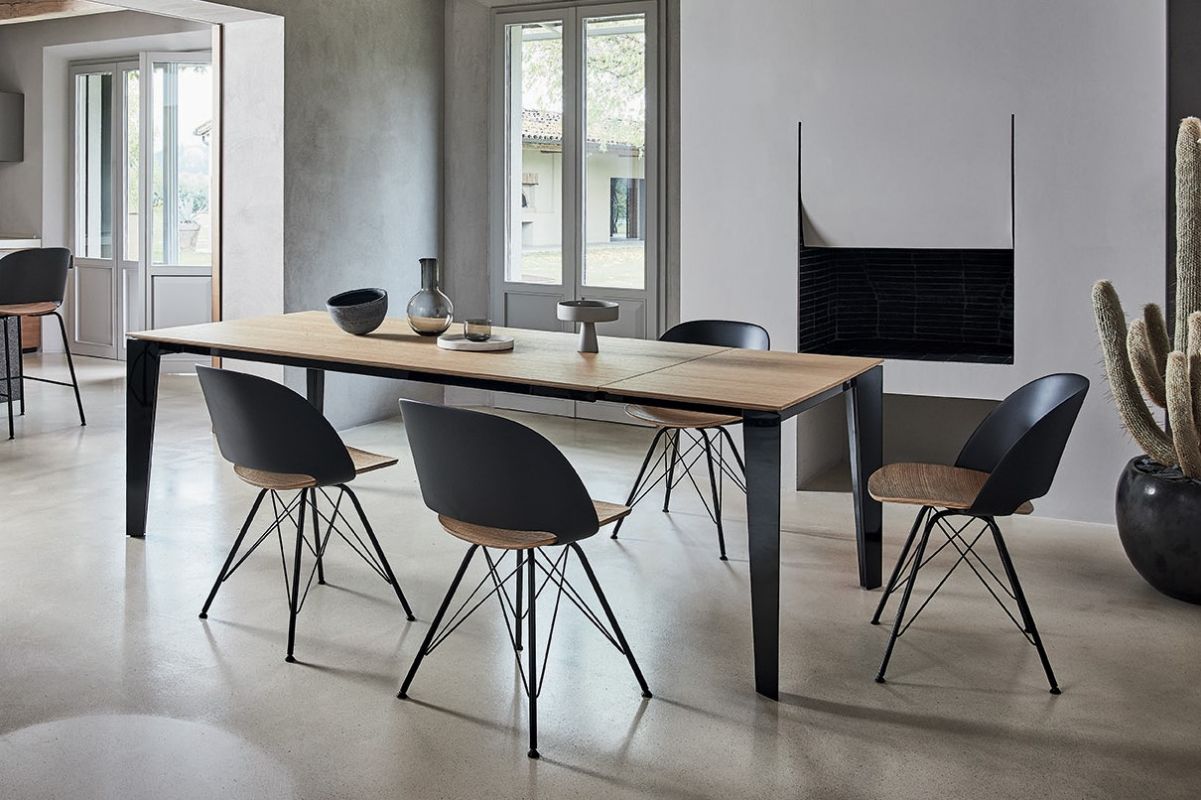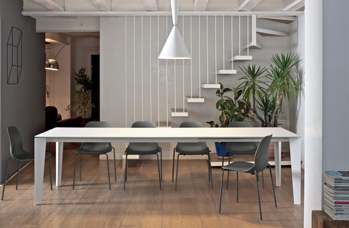 Table with extensions and lacquered Metal frame. Top in melamine, laminate Fenix, Anti-scratch Unicolor, veneer, glossy Glass, velvet matt Anti-scratch Glass, SuperCeramic or SuperMarble