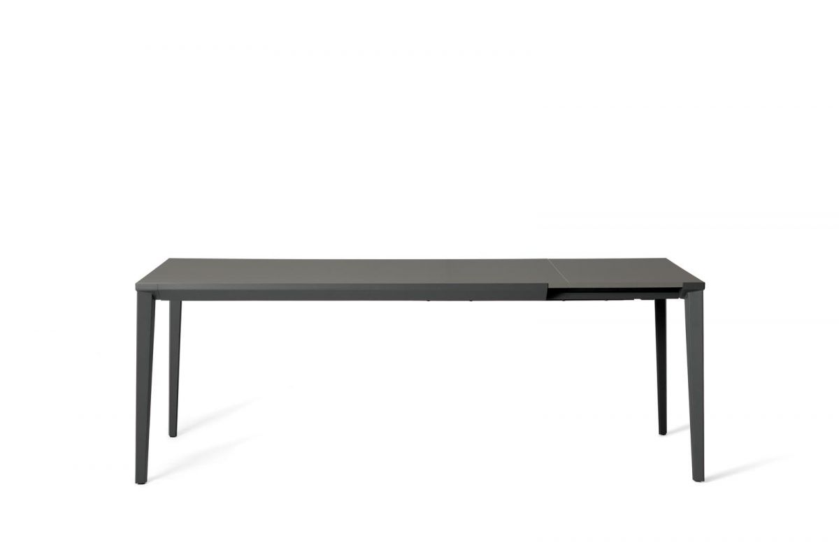 Extending table with stainless Metal frame. Top in melamine, laminate Fenix, Anti-scratch Unicolor, veneer, glossy Glass, velvet matt Anti-scratch Glass, SuperCeramic and SuperMarble.