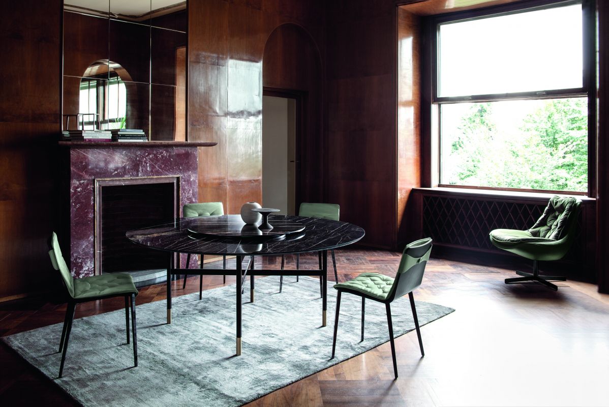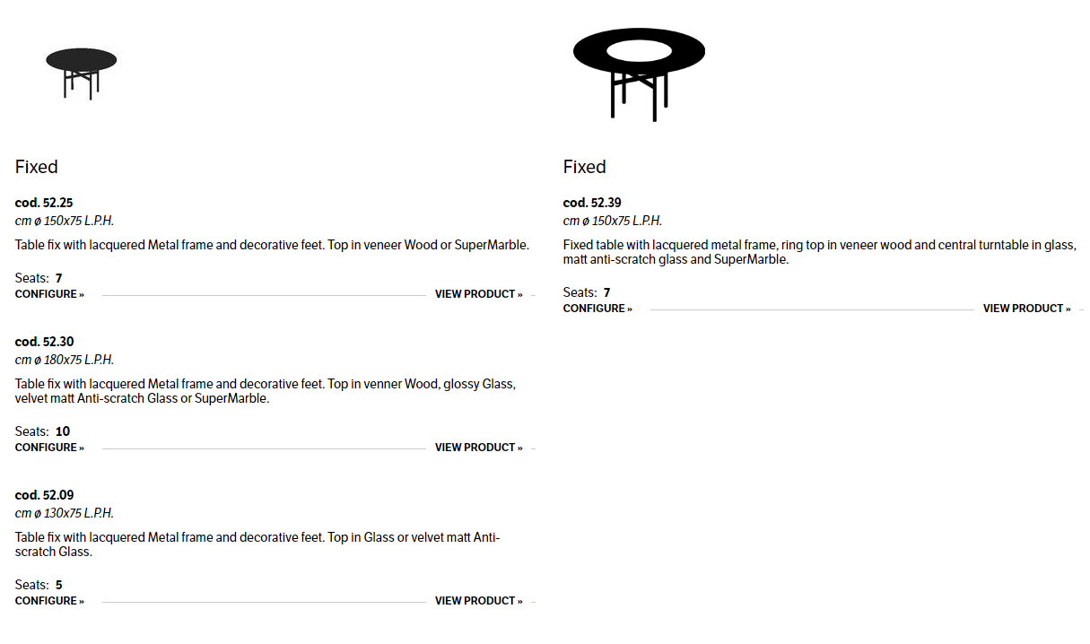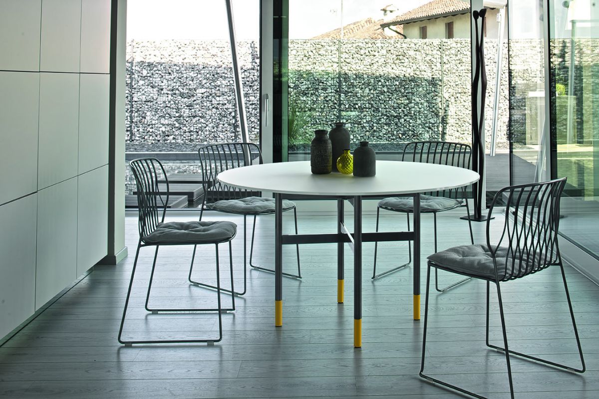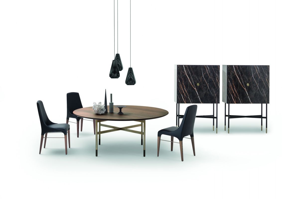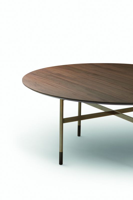 Table fix with lacquered metal frame and decorative feet. Top in venner wood, glossy glass, velvet matt anti-scratch glass or SuperMarble.