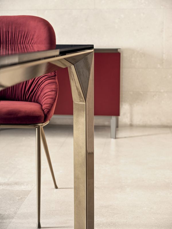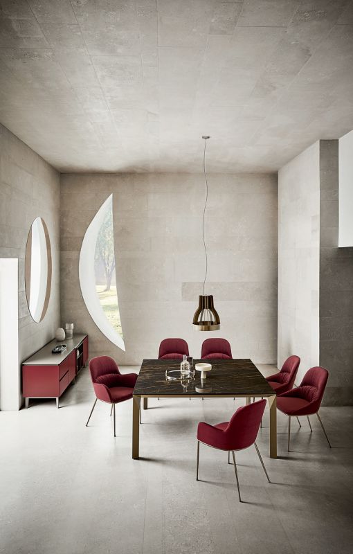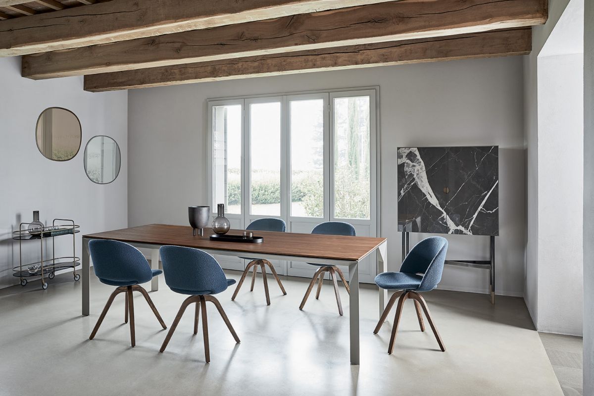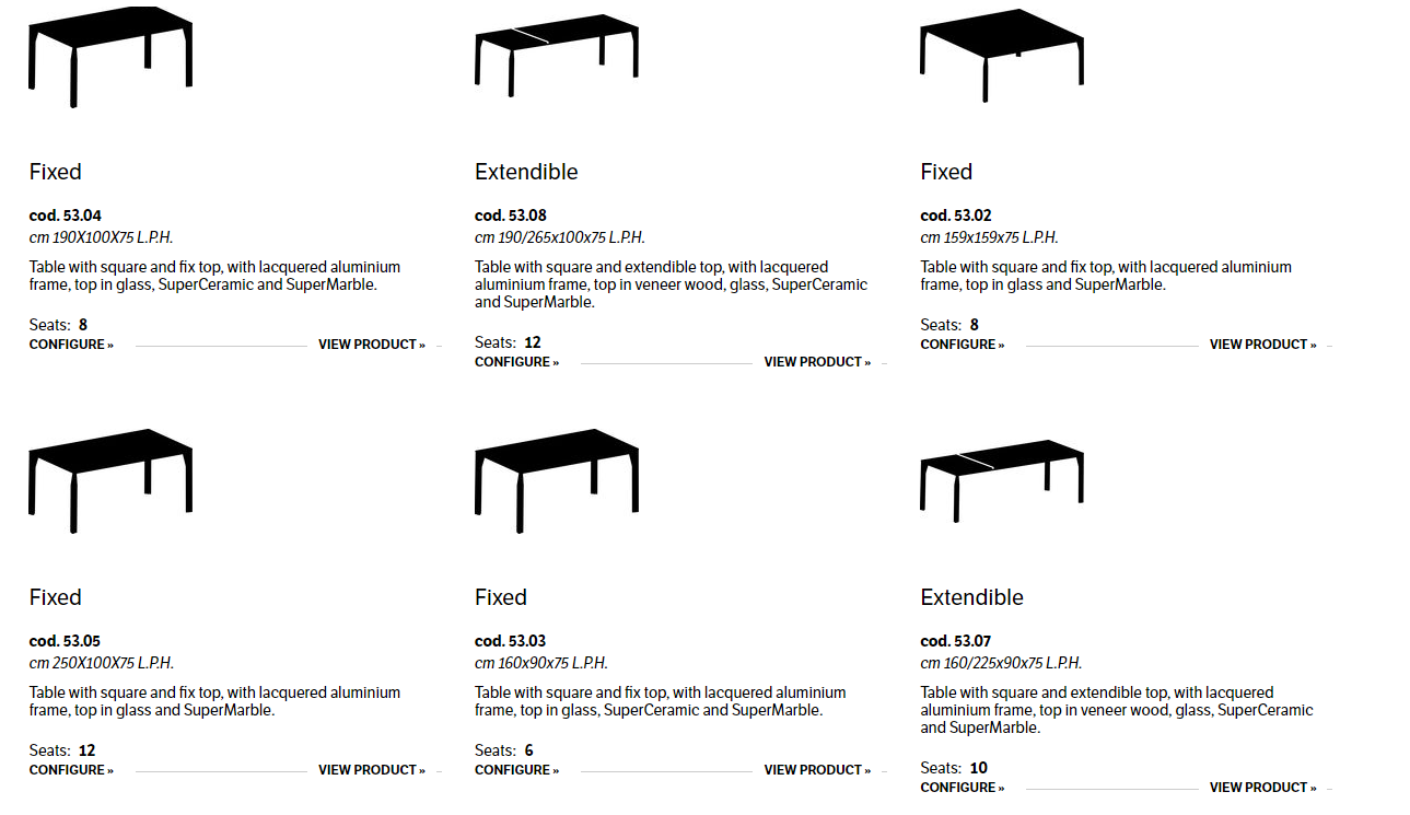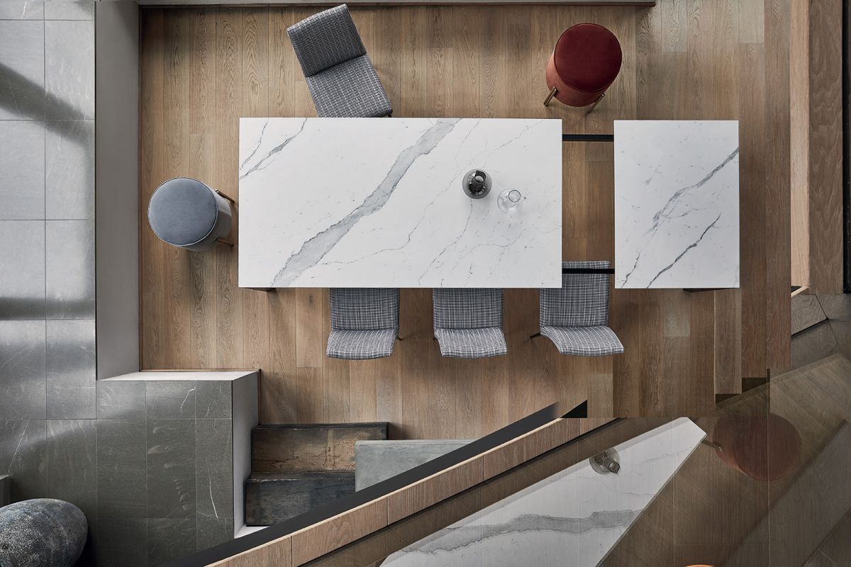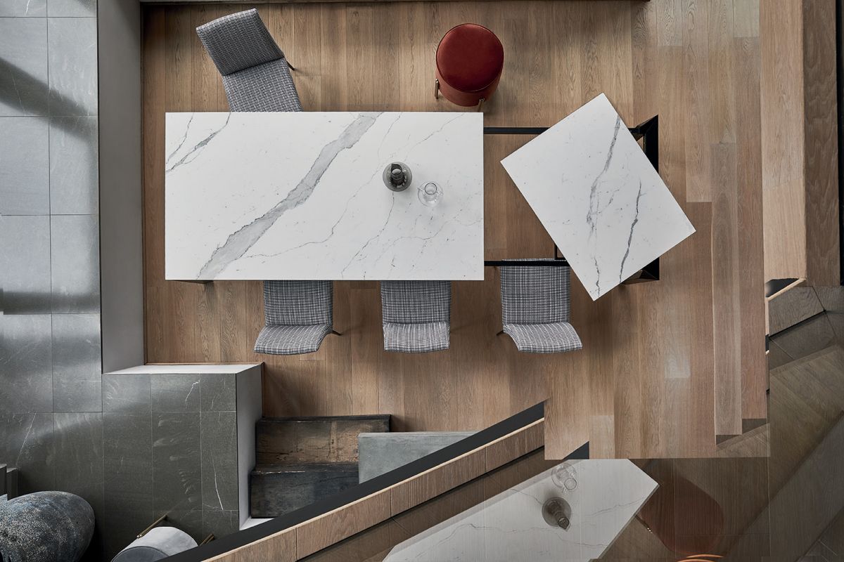 Fixed and extendable table with lacquered aluminium frame. Top in veneer wood, glass, SuperCeramic and SuperMarble.
