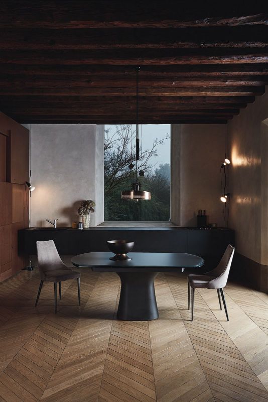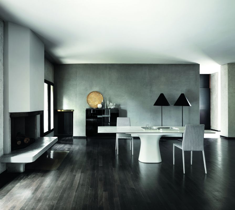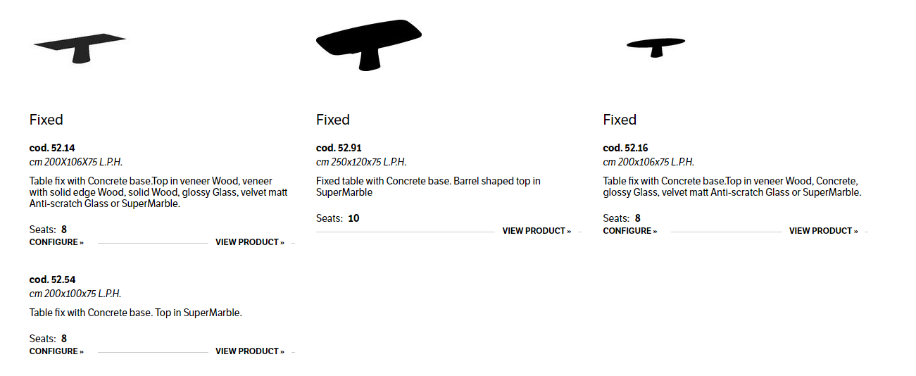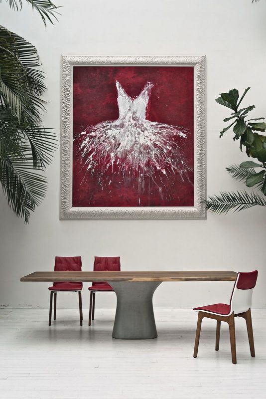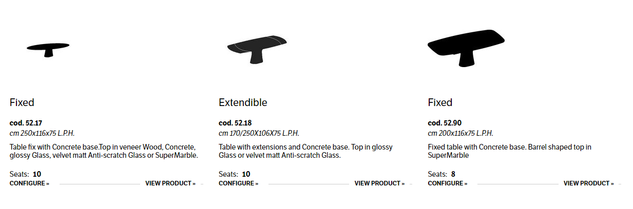 Table fix or with extensions and with Concrete base. Top in veneer Wood, veneer with solid edge Wood, solid Wood, heritage walnut solid Wood, glossy Glass, velvet matt Anti-scratch Glass or SuperMarble.