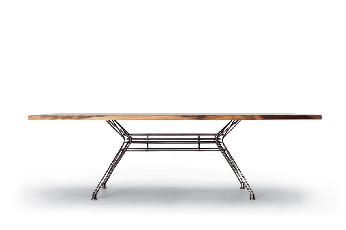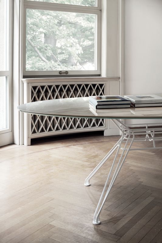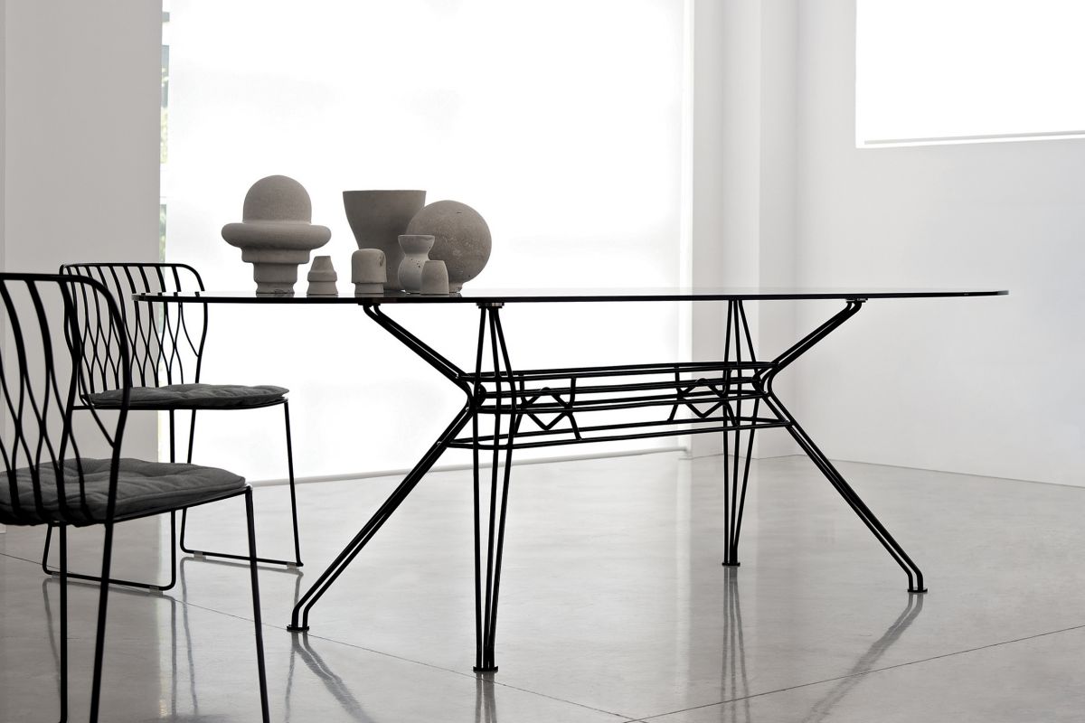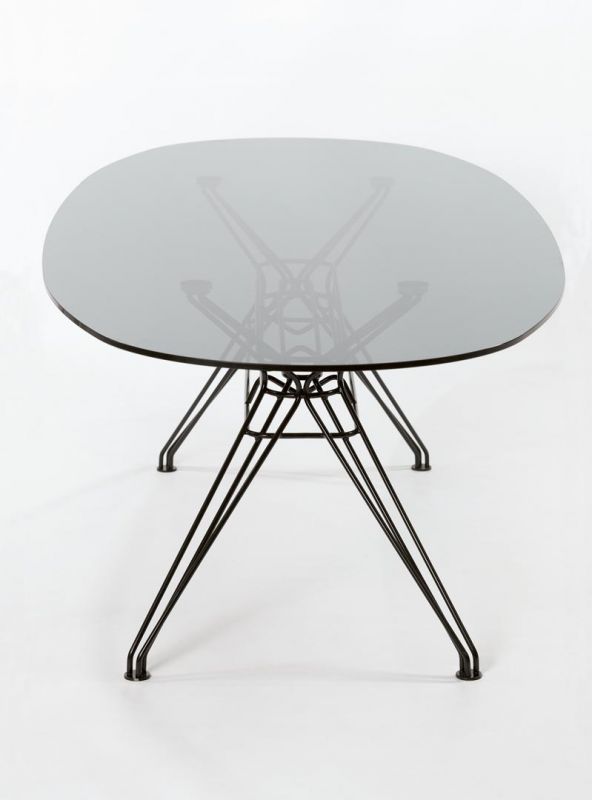 Rectangular or elliptical fixed table with lacquered Metal frame. Top in heritage walnut solid Wood, solid Wood, veneer with edge in solid Wood, veneer, glossy Glass, velvet matt Anti-scratch lacquered Glass or SuperMarble.