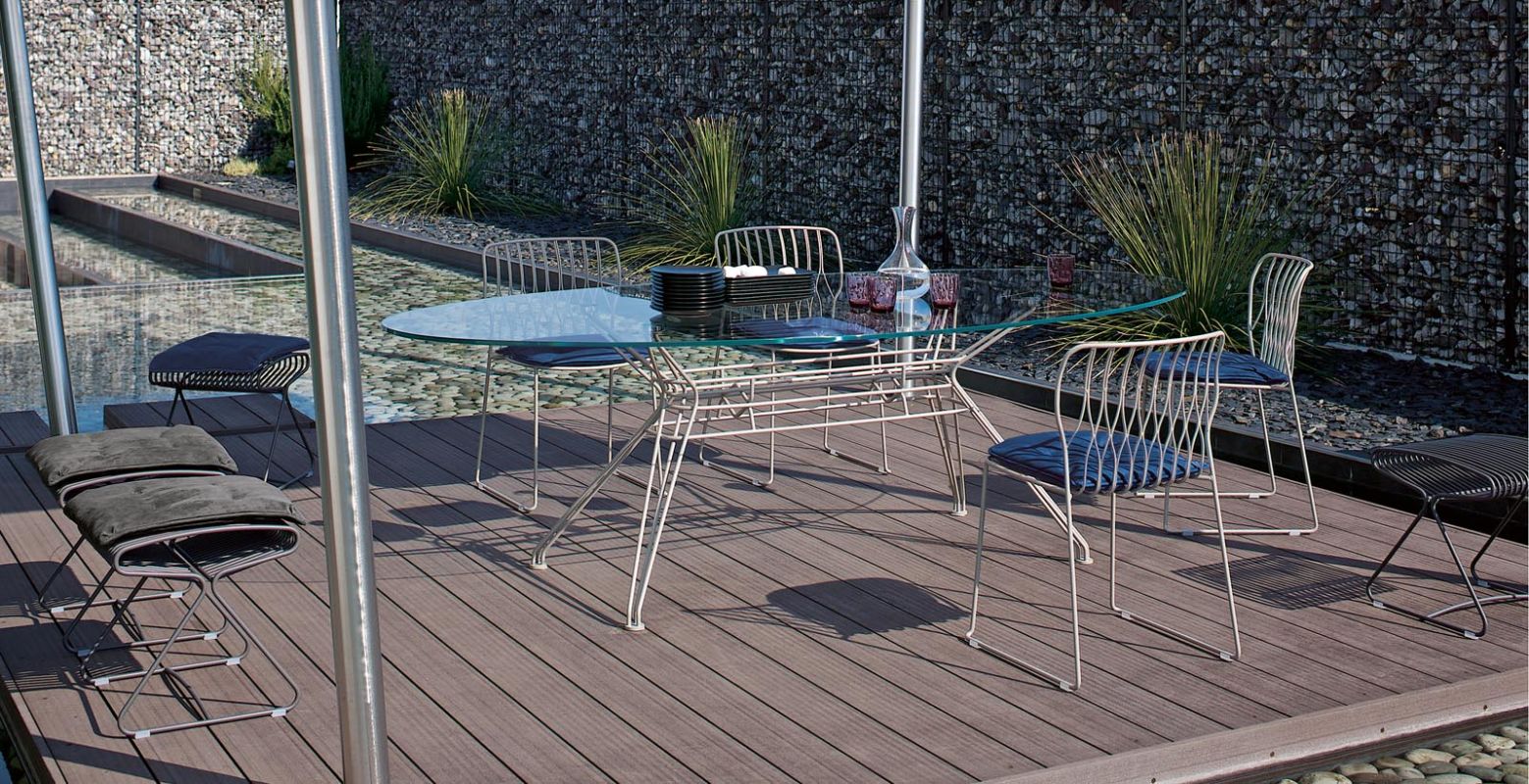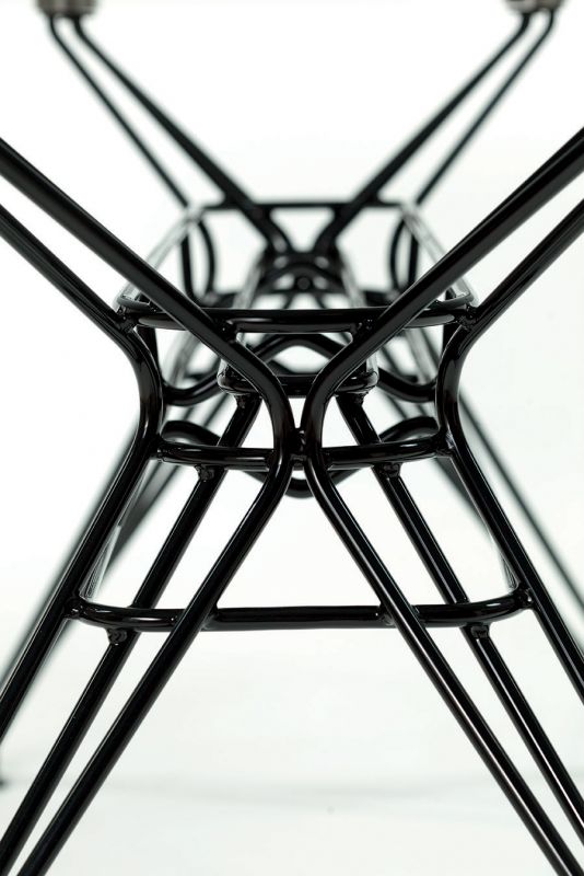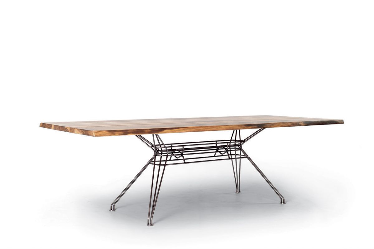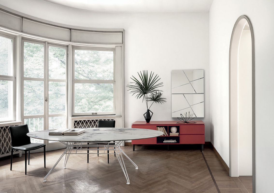 Rectangular or elliptical fixed table with lacquered Metal frame. Top in heritage walnut solid Wood, solid Wood, veneer with edge in solid Wood, veneer, glossy Glass, velvet matt Anti-scratch lacquered Glass or SuperMarble.