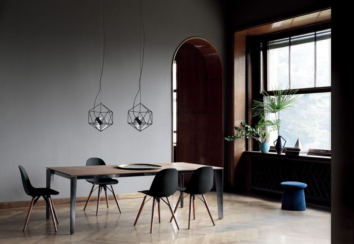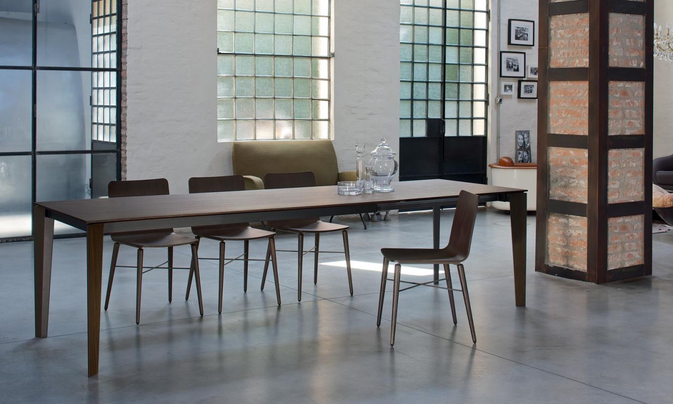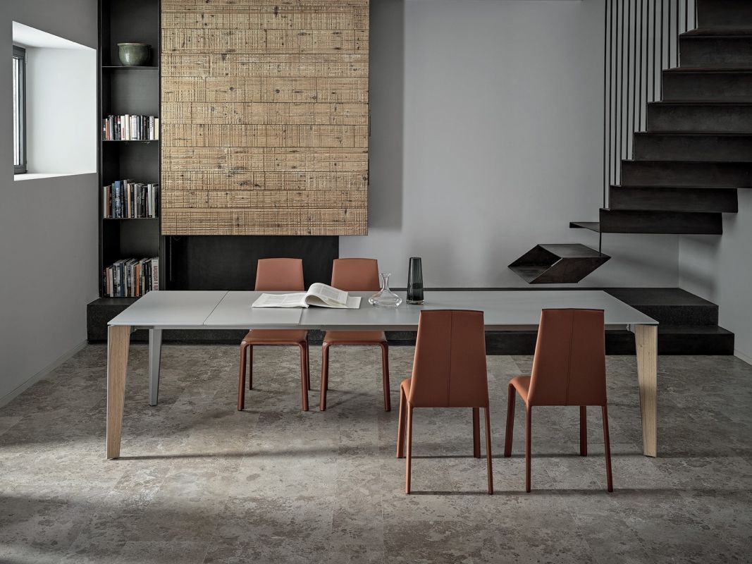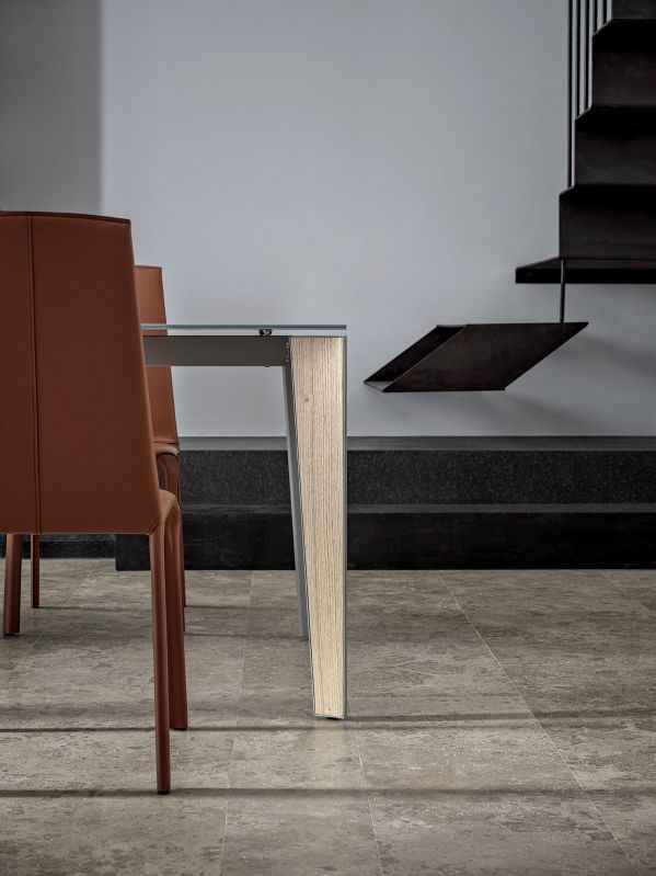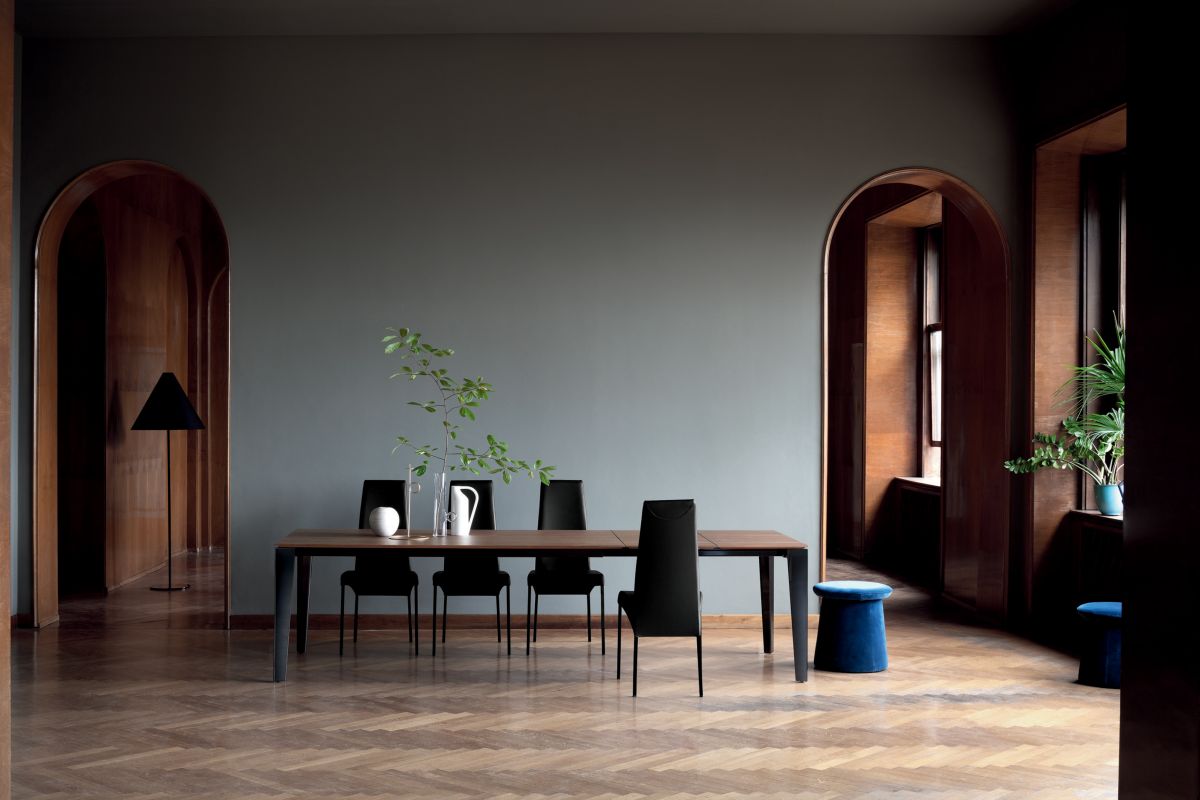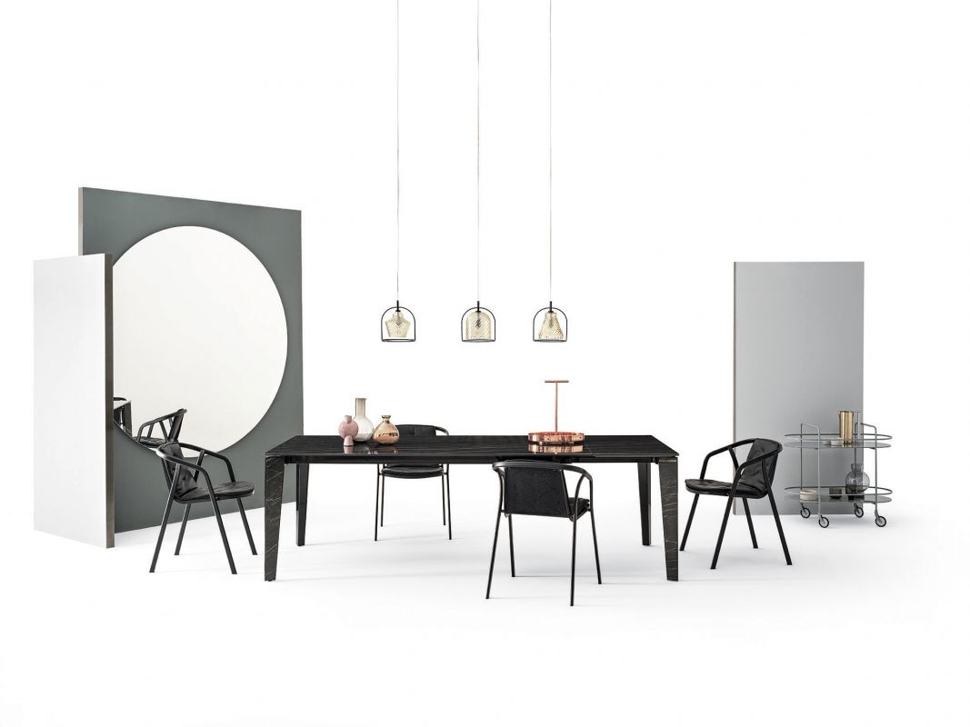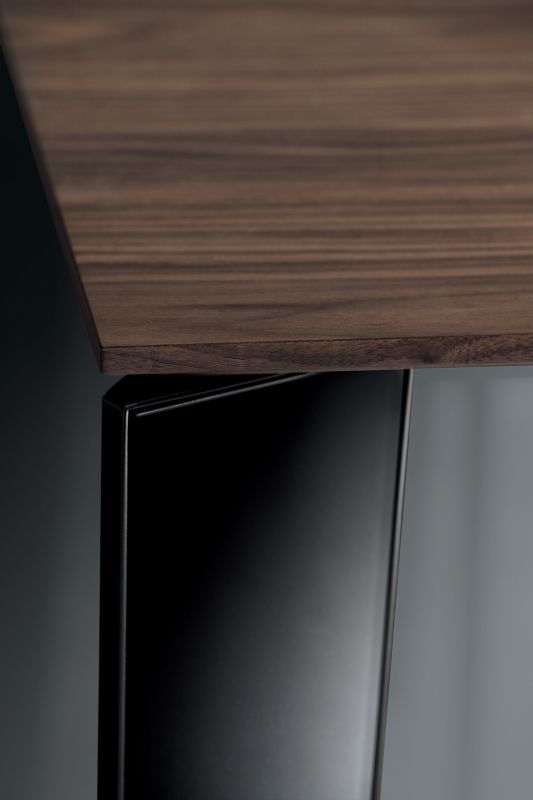 Table with extensions and lacquered Metal frame. Top in melamine, laminate Fenix, Anti-scratch Unicolor, veneer, glossy Glass velvet matt Anti-scratch Glass, SuperCeramic and SuperMarble