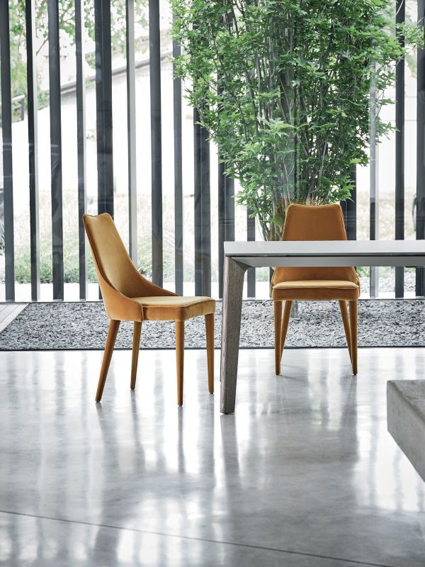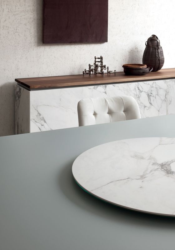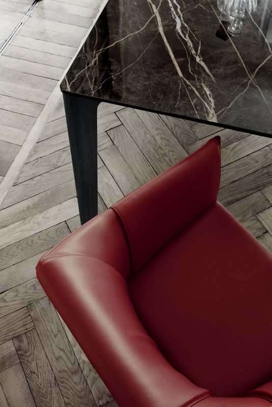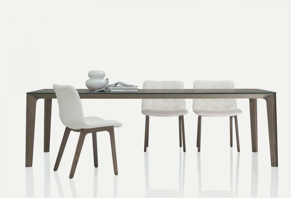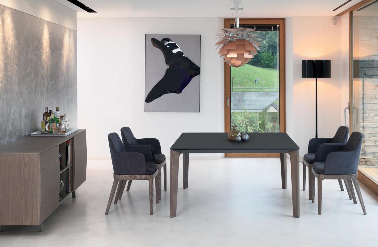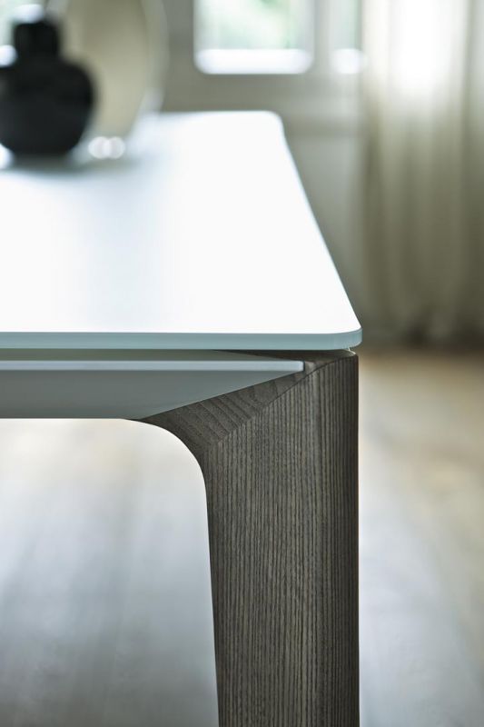 Table fix or with extensions with metal frame in matching colours with top finishing, solid wood legs. Top in lacquered wood, glossy glass and velvet matt anti-scratch glass.