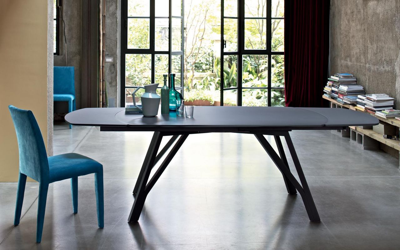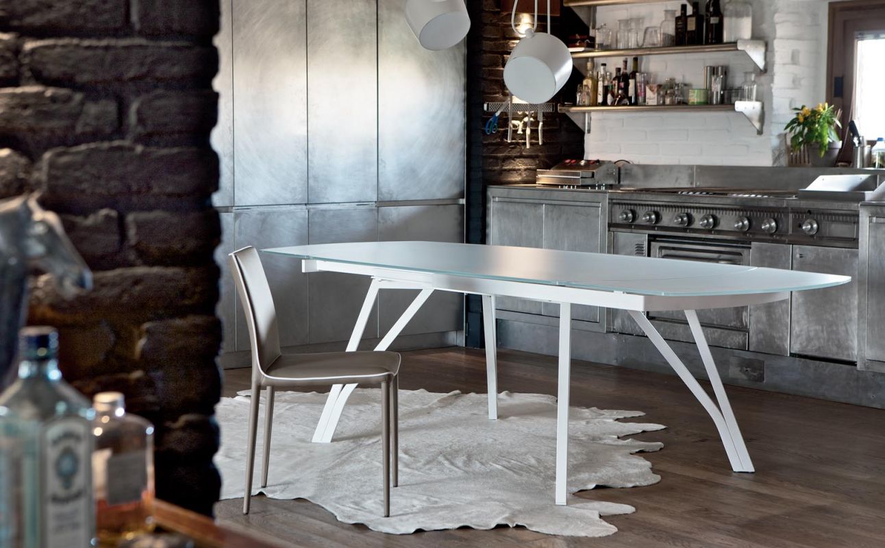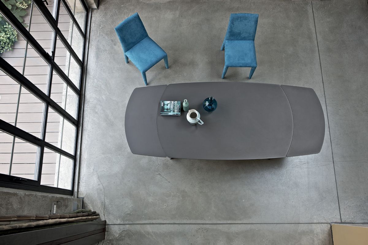 Elliptical table with lacquered metal frame and extensions with telescopic synchronised opening mechanism. Top in lacquered wood, glossy glass or velvet matt anti-scratch glass.
