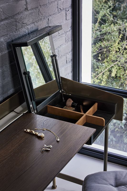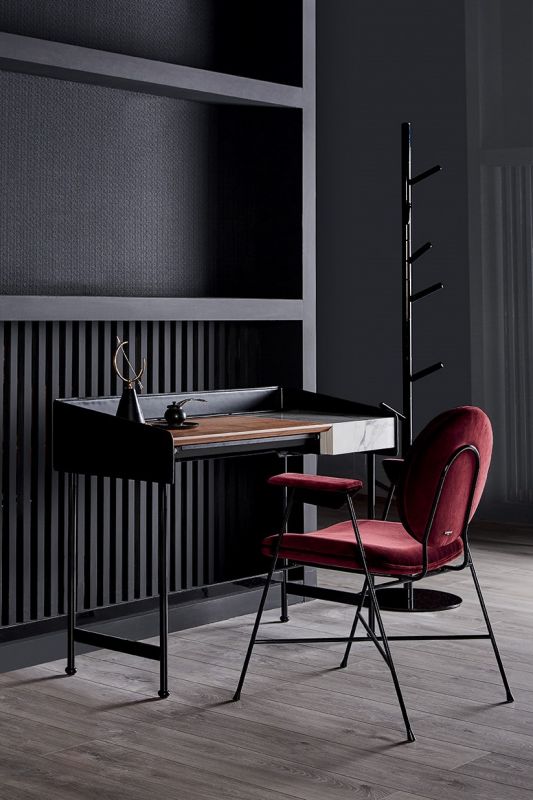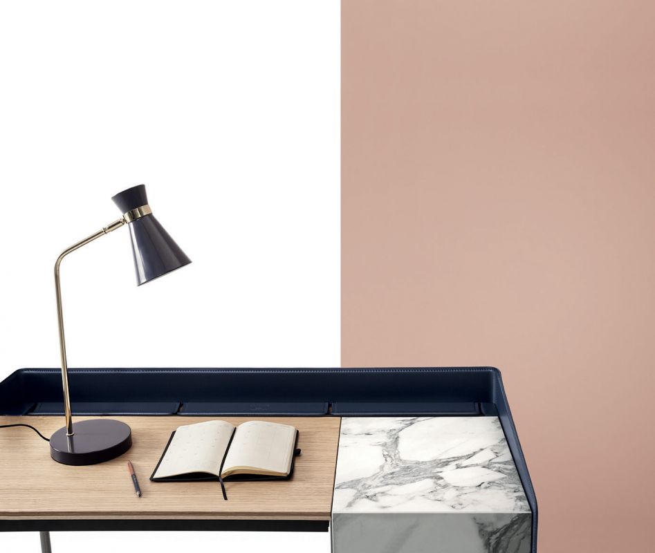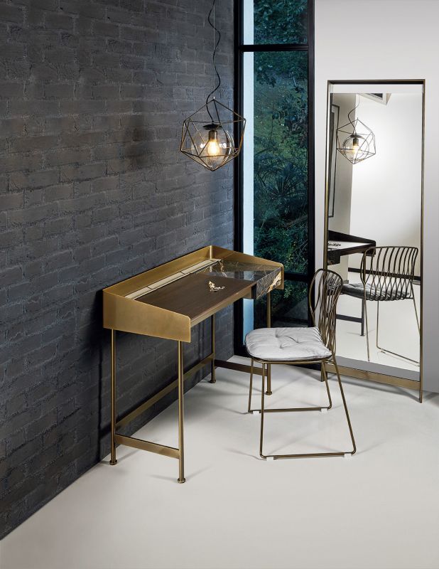 Desk with frame and outer edge in lacquered metal frame or outer edge in hideleather, with 3 small storages in hideleather matching with outer edge, wooden top, flap for Secret compartment in lacquered wood or Supermarble
