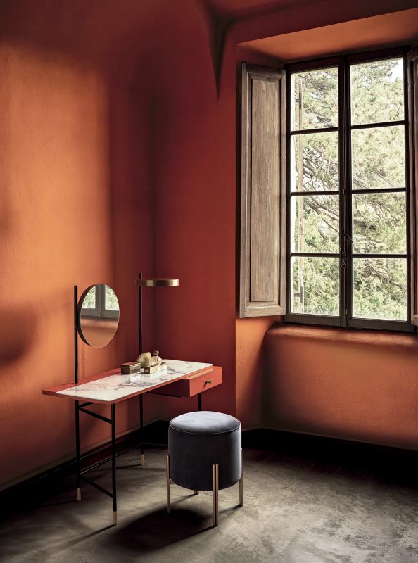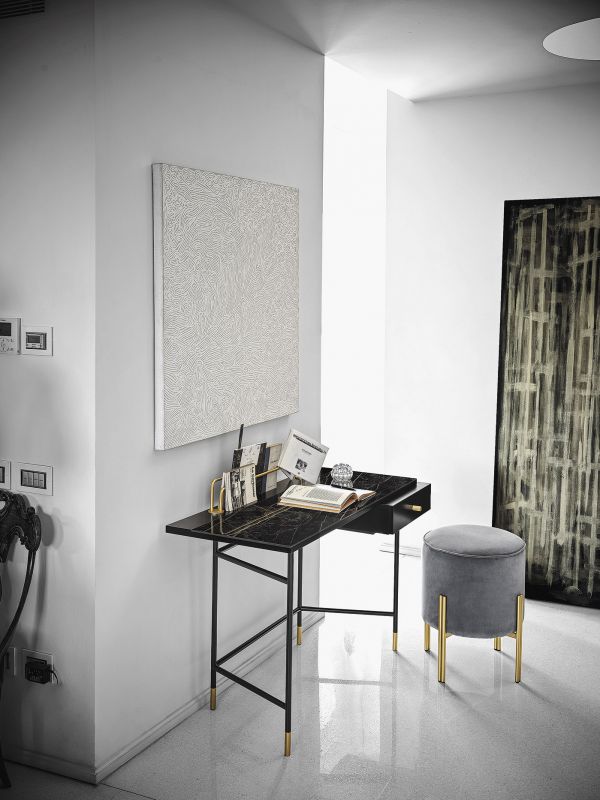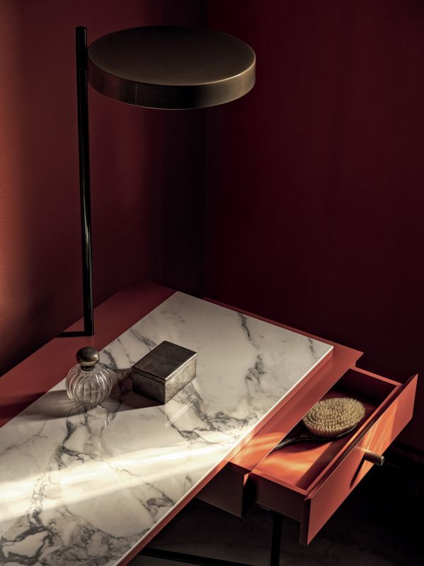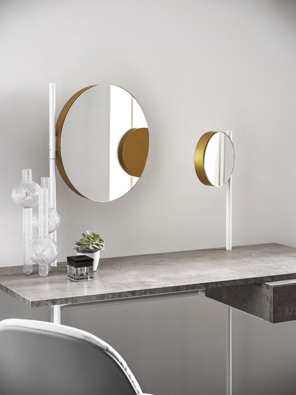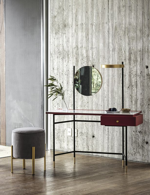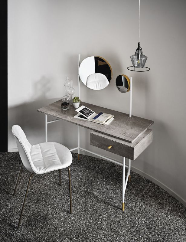 Desk with adjustable mirror and light, mirror only or desk only. Laquered metal frame. Decotaive details (feet, drawer's handle, mirror's support and light) in lacquered steel. Top and drawer in melamine.