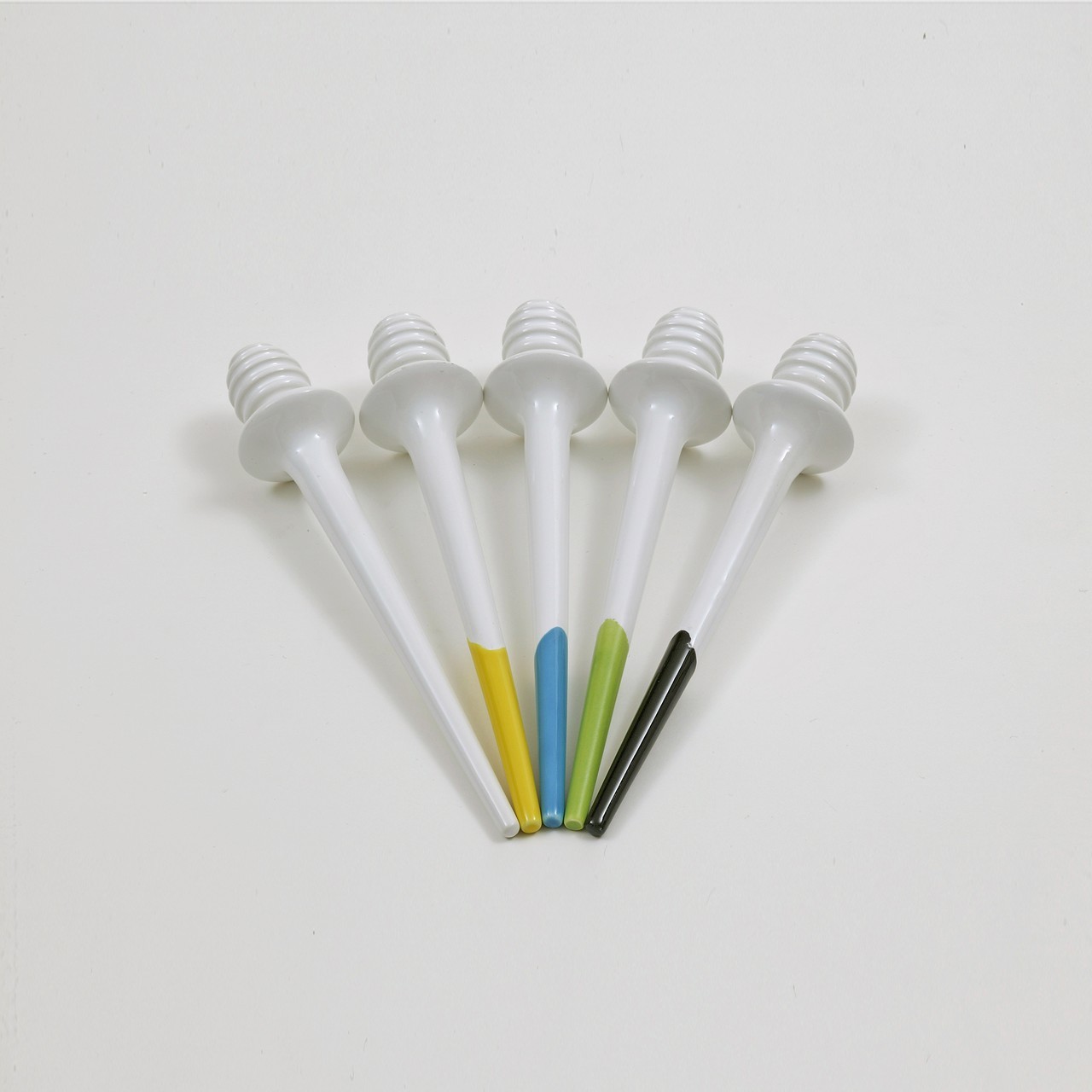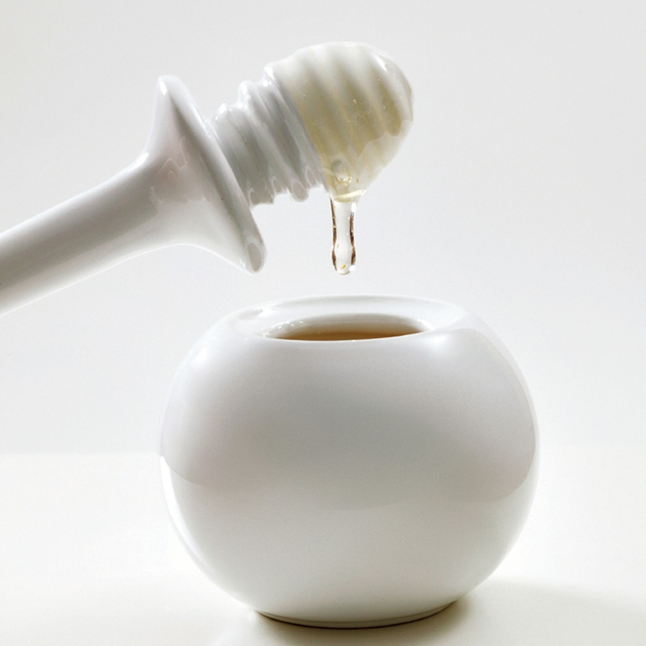 Mielito è un dosatore per il miele in ceramica elegante e pratico, caratterizzato da una nota di colore su fondo bianco che ricorda una traccia lasciata da un anonimo mangiatore di miele.