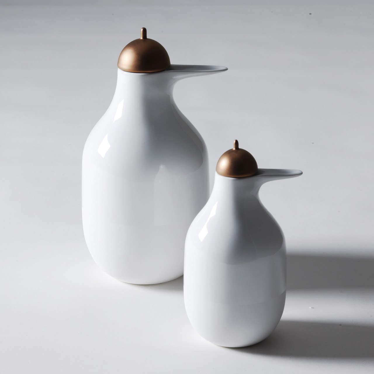 Forme morbide e femminili ispirate all'eleganza del pellicano caratterizzano questo oggetto contenitore. I contorni dell’uccello esotico diventano sottilmente un recipiente in ceramica facile da afferrare che può essere usato per servire acqua, succo, caffè e latte. Umorismo, immaginazione e la migliore tradizione della ceramica si uniscono per dar vita a questo compagno ottimista.
