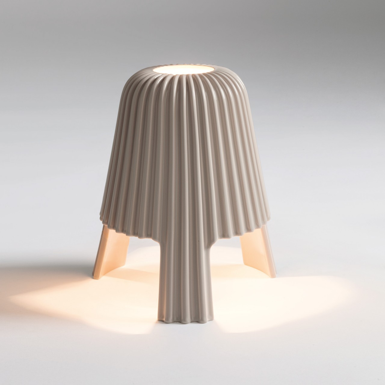 Il plissè, trasportato nel mondo delle ceramiche, dei colaggi e delle finiture manuali, ha dato forma ad una superficie finissima che ondeggiando come la seta nell'aria, genera l'anima della lampada Silk.