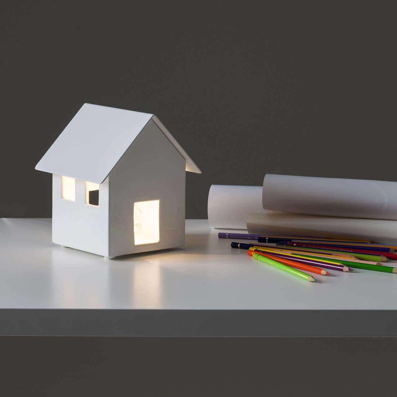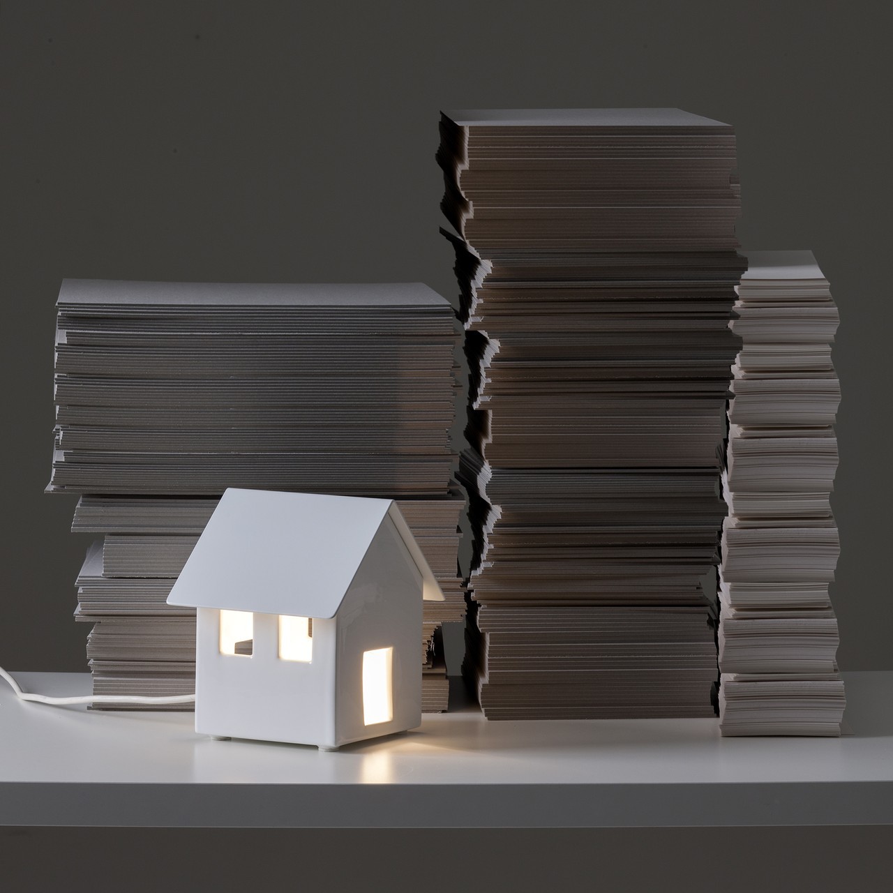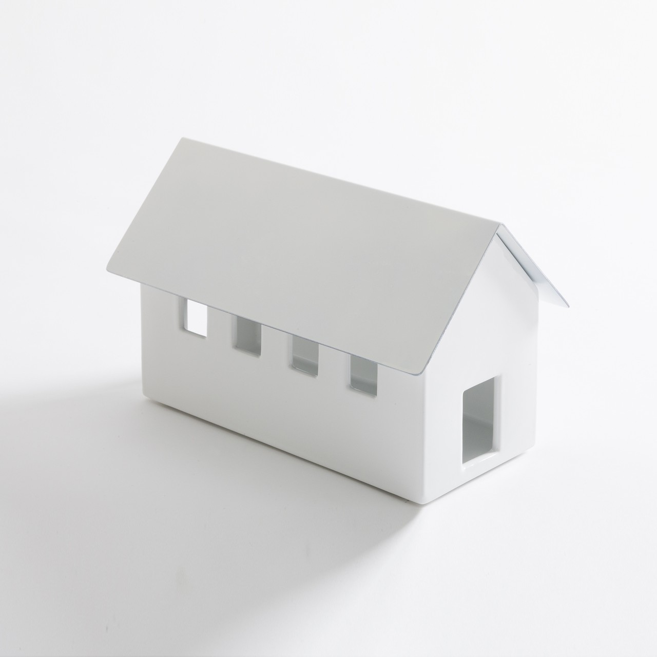 Piccole architetture, custodi di energia. Casette in ceramica dalla forma iconica, nate per nascondere al proprio interno le antiestetiche multiprese. Inserendo una semplice lampadina, si riempiono di luce che crea suggestivi effetti ottici.
