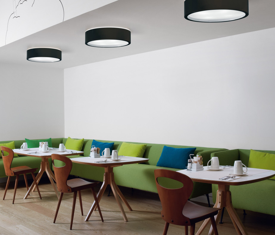 ELEA collection is an absolutely contemporary and non-temporal product because of its cylindrical and flat format. These products are made of polyurethane with a brilliant lacquered finish. The dimming versions have been created to offer a greater sense of comfort. Upper and bottom diffuser included. Elea collection is available in two sizes both for ceiling and pendant version.