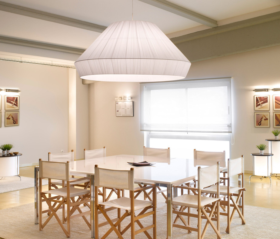 Mei is a pendant family composed of different shapes and lines but with a common denominator: the ribbon. The ribbon shades are entirely made in BOVER, starting with the frames welding to the ribbon process itself. This allows us to totally control the product quality, custom process and delivery terms. The Mei lamps are great for environments where a warm light is required. They mostly have a wide diameter, offering as a result a good direct light. Discrete and decorative since its mechanical structure is hidden inside the lamp, as if they were in a second place. Lamps are held by thin tensor wires that enhance its lightness. With Mei collection we have developed tailor-made lamps with important dimensions, and we have been able to make a quality packaging to ensure the shipment worldwide.