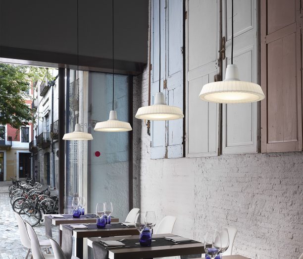 Joana created the first Marietta two years ago, a very personal interpretation of the classic industrial suspended lamps that lit most factories in Europe in the early twentieth century. The Marietta lamp is contemporary, decorative, warm, and enveloping. The original Marietta is clearly an indoor light but Joana wanted to adapt it for outdoor settings. To do so, the Outdoor version is made from white polyethylene, with which she imitated the texture and wave-like form of the ribbon-shade in the original design. It is a lamp designed for terraces, parasols and pergolas; and also for kitchens, bars and restaurants. It is a perfect go-to for all these spaces: resistant, easy to clean and very versatile. This versatility has to do with the timelessness that Joana is always looking for in her designs. Her works can stand next to classical pieces and with contemporary ones. This ensures they can be incorporated naturally into people's lives. The Marietta Outdoor is, for many reasons, an example of 'slow-cooked' design where non-conformity and Joana's conviction play important roles in creating the best possible final product. "Every little detail of Marietta Outdoor was thought about a thousand times. Bover takes this precise approach with every lamp they design. This is what separates many products from others. The quality lies not only in the materials but also in the industrial development behind them", explains Joana. This is why Marietta Outdoor is the best Marietta we have been able to develop.