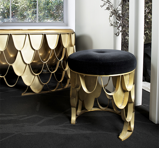 Koi Carp is a recurring symbol of Japanese culture. Its natural colour mutations reveal their capacity to adapt, just like KOI Stool. Featuring a base in brushed brass matte and a top in cotton velvet, this upholstered stool will add refined elegance to any modern contemporary home decor.