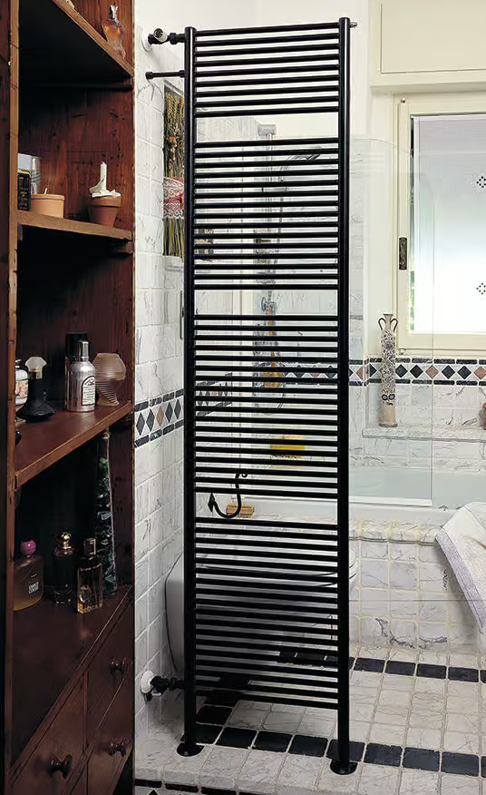 SHAR, START and KUAD heated towel rail, with the addition of feet and side or ceiling fittings, can be used as partitions in bathrooms, kitchens or other rooms wherever you want a stylish, functional separation.