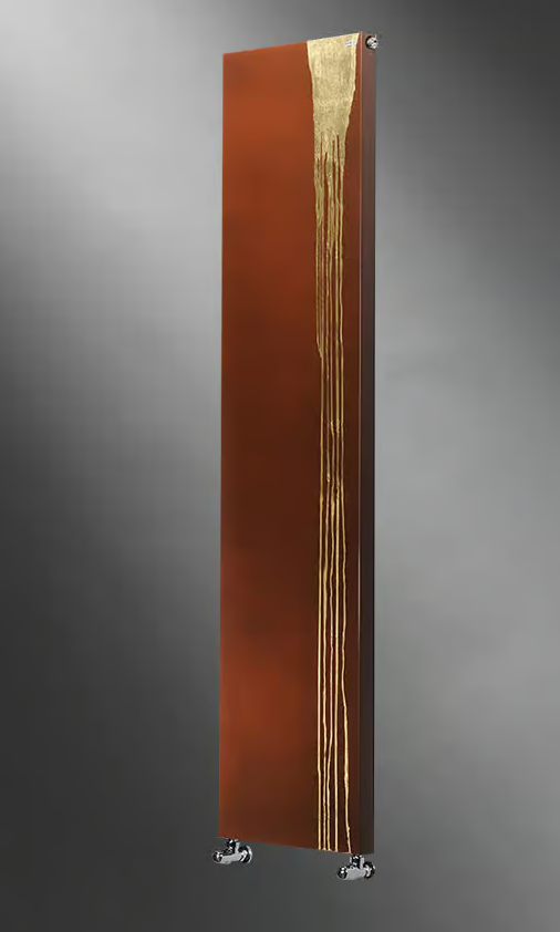 Steven Cavagna has opted here to use precious gilded leaf details set against an oxidised steel background. An imaginary stream of cast gold arousing the imagination. The stream is hand-made and always different for each radiator.
