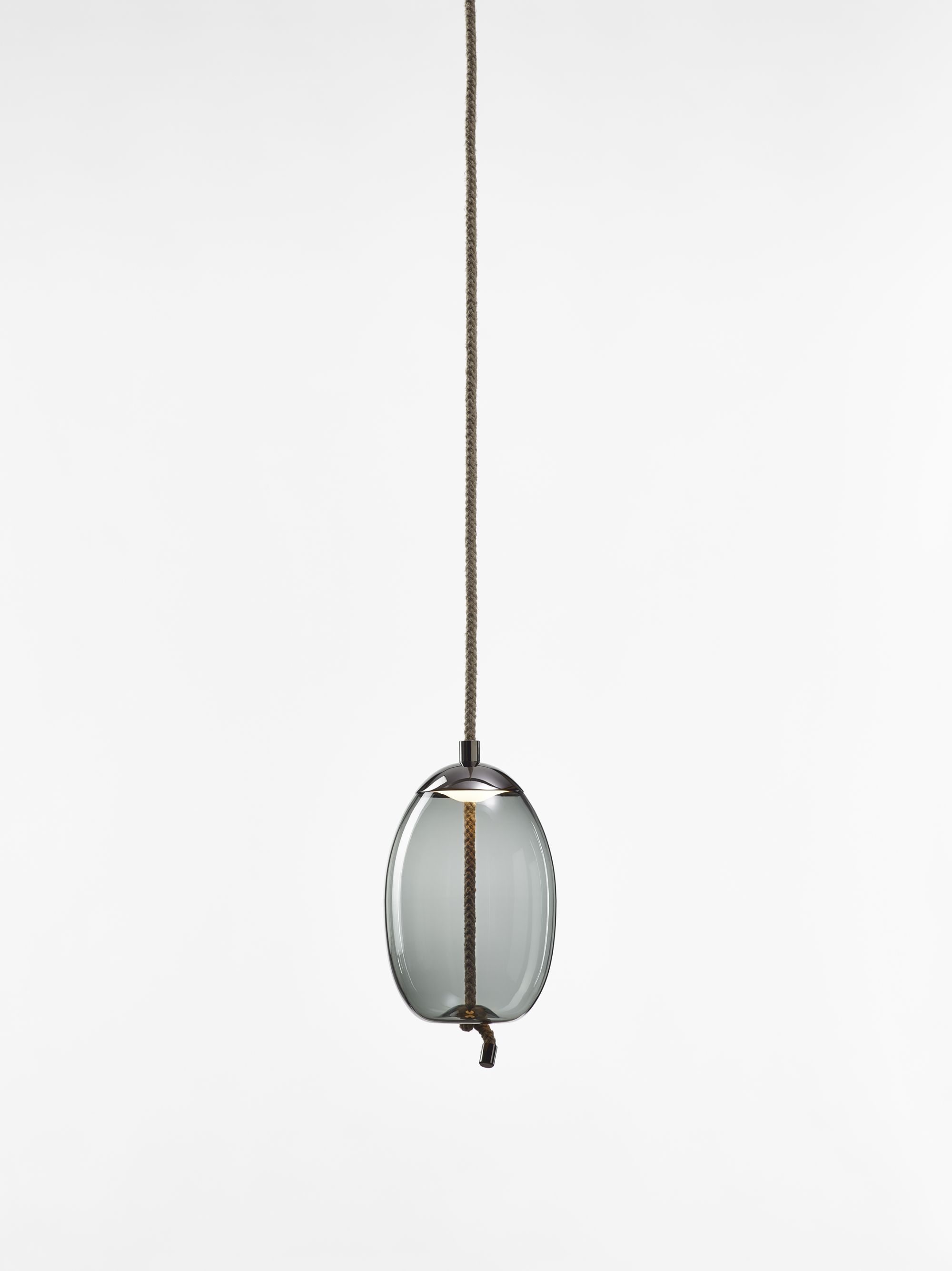 Knot is a collection of stately pendant lights that appose two dramatically dissimilar materials. The design combines coarse natural fibre with smooth, transparent blown glass to arouse a contrast as striking as it is dignified.