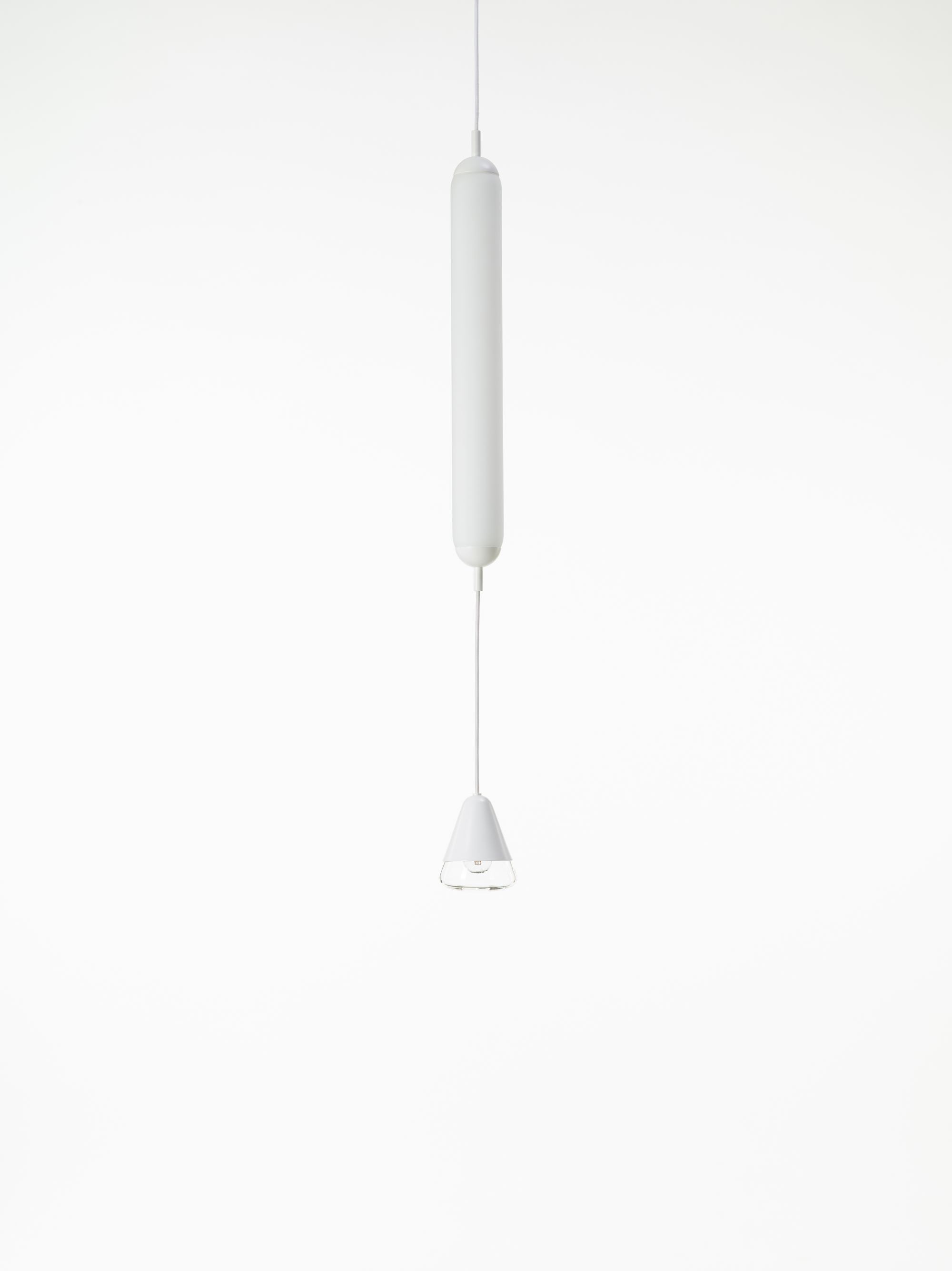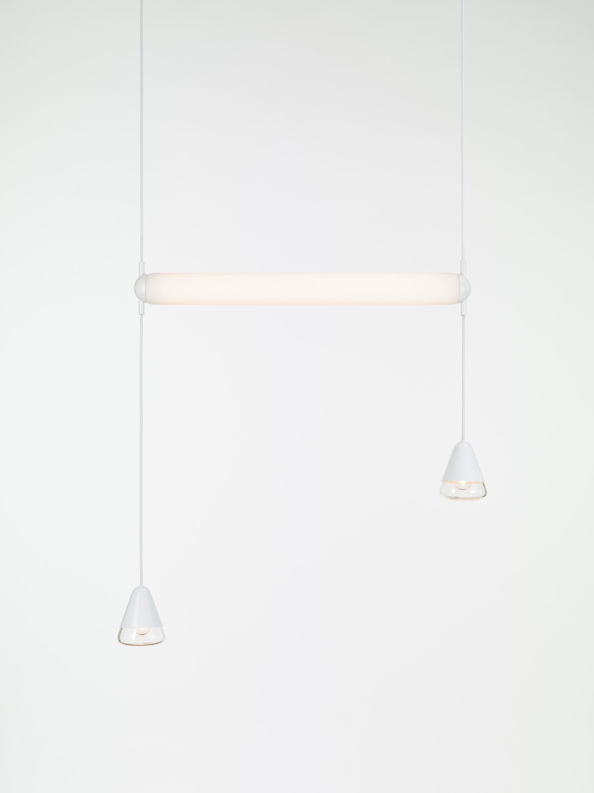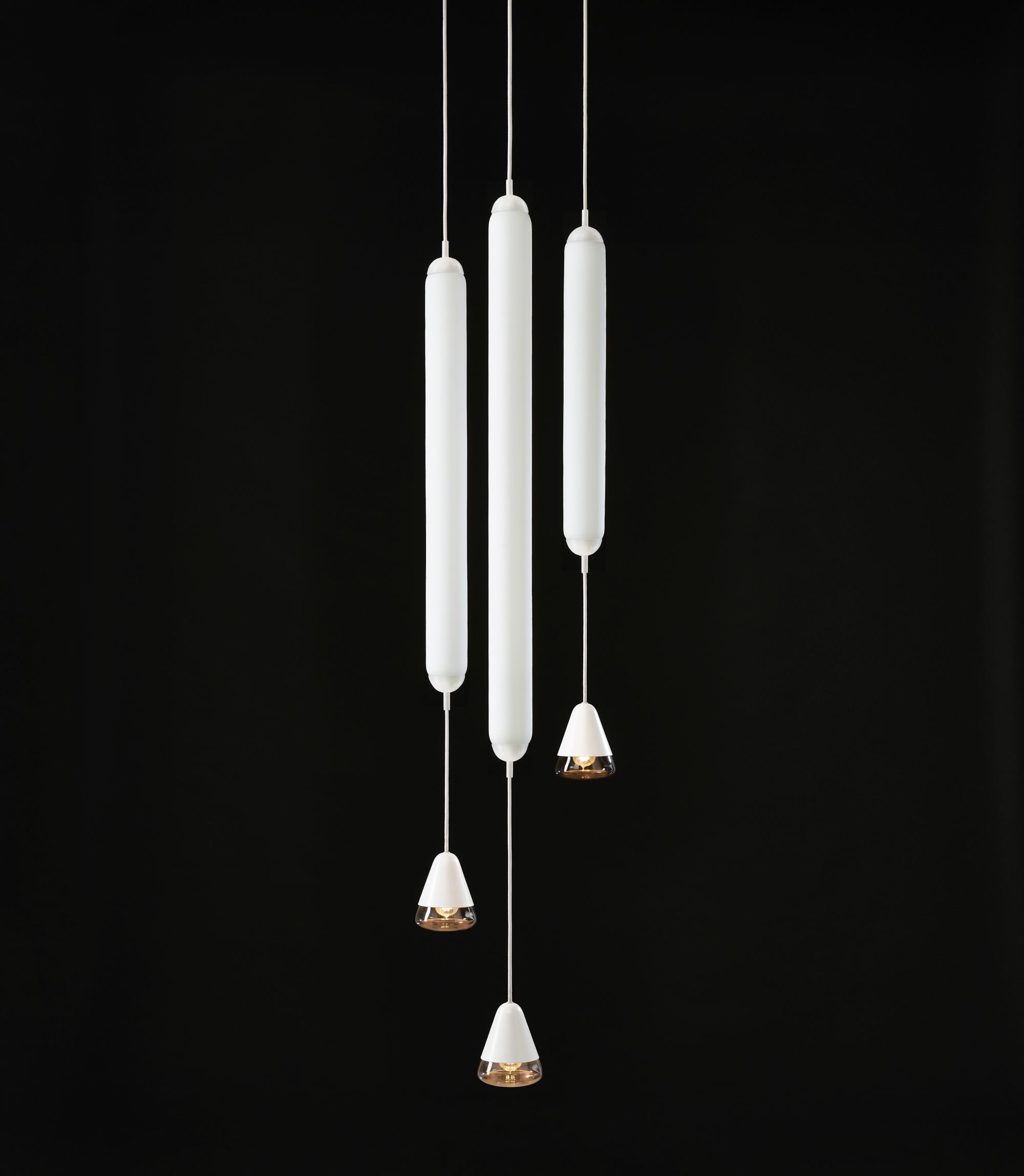 The Puro collection comprises a single bell light suspended beneath a vertical tube and dual bell lights suspended beneath a horizontal tube. When standing alone as single tubes, amazing installations can be created, such as a screen to divide space and evoke an intimate atmosphere bordering on scenography.