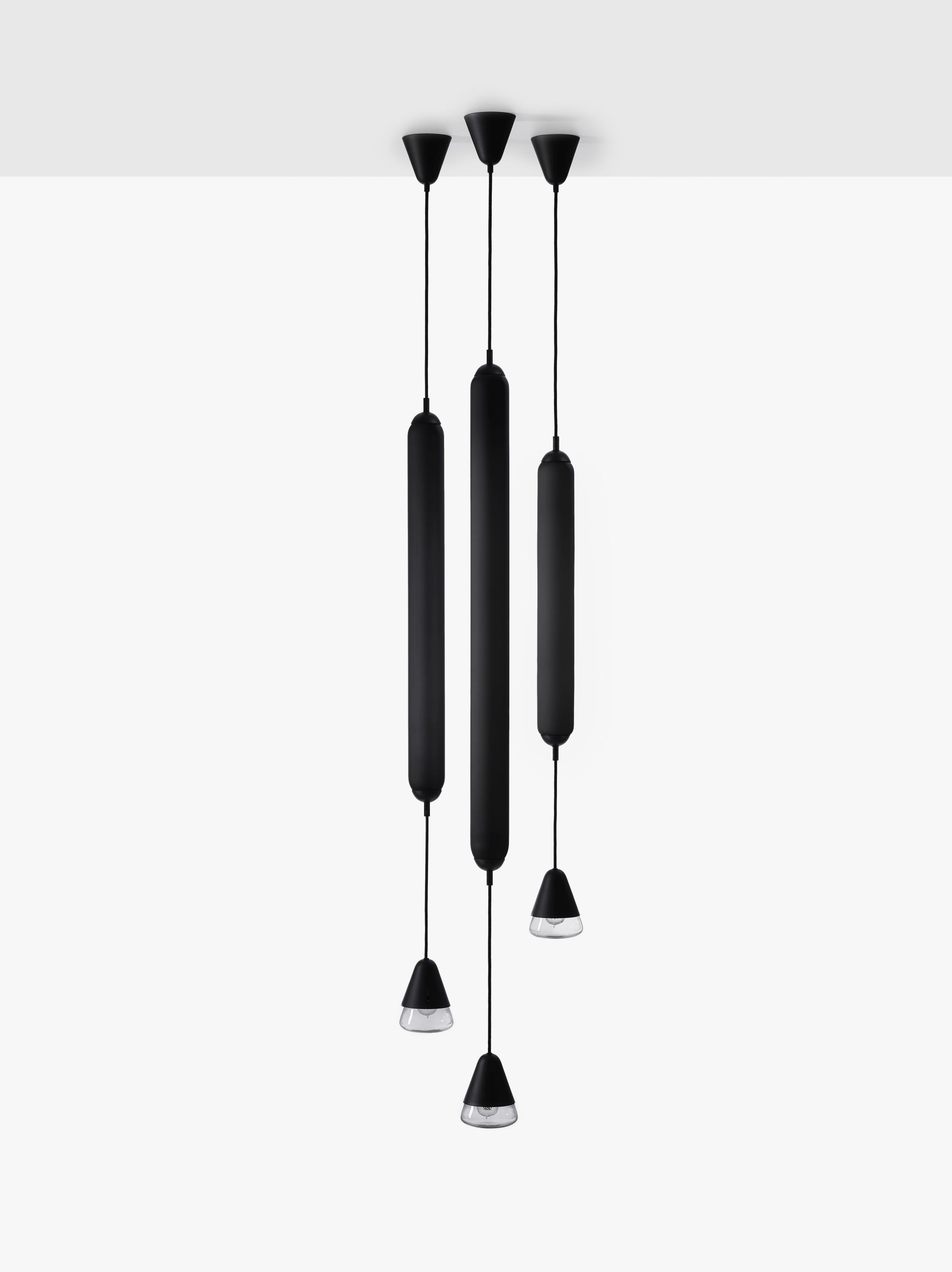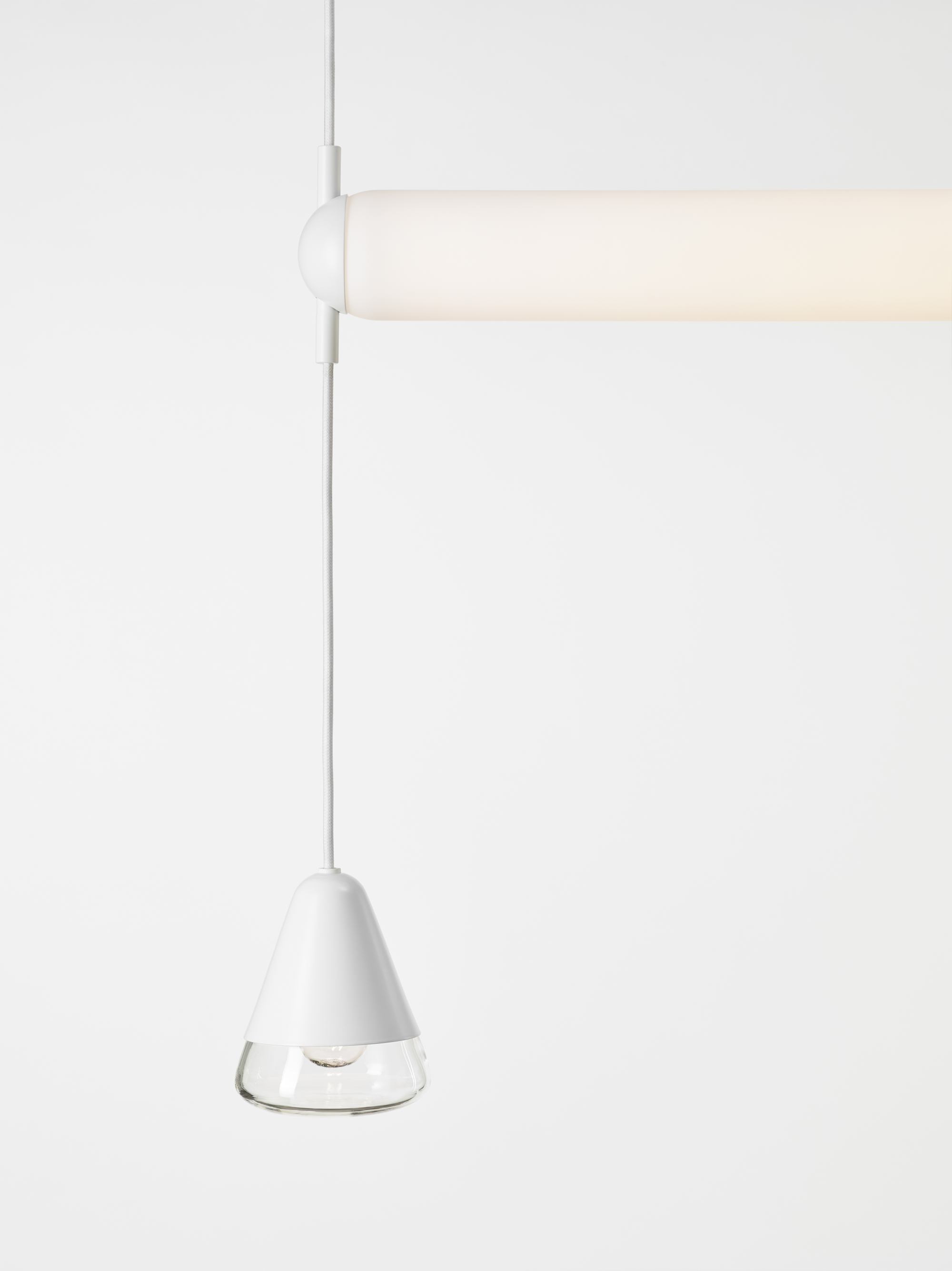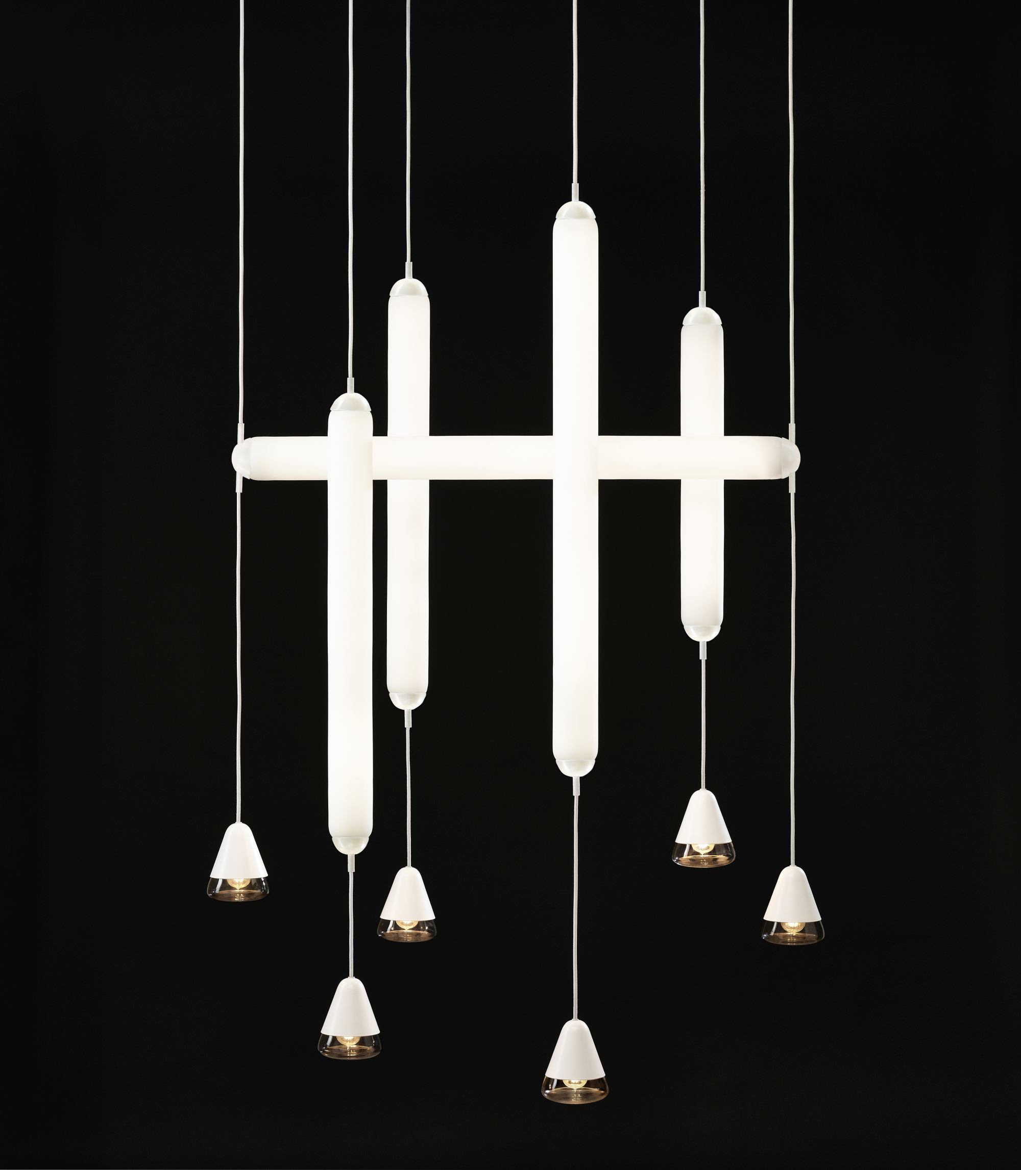 The Puro collection comprises a single bell light suspended beneath a vertical tube and dual bell lights suspended beneath a horizontal tube. When standing alone as single tubes, amazing installations can be created, such as a screen to divide space and evoke an intimate atmosphere bordering on scenography.