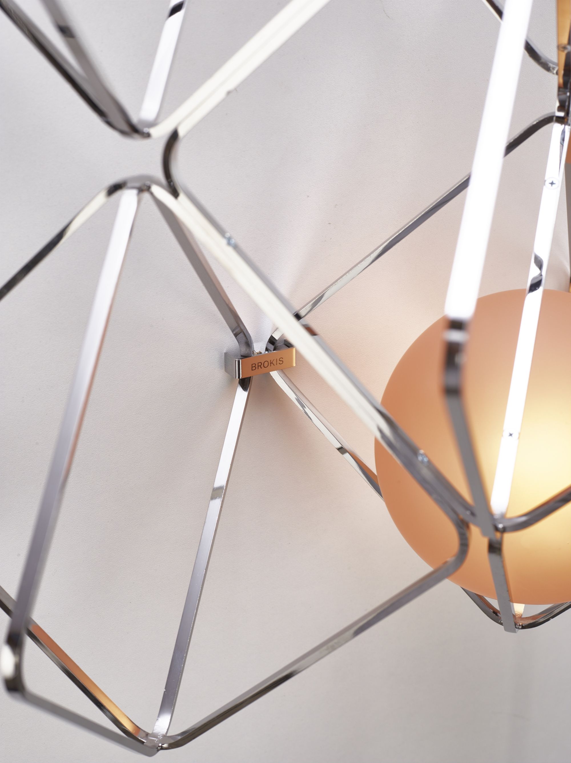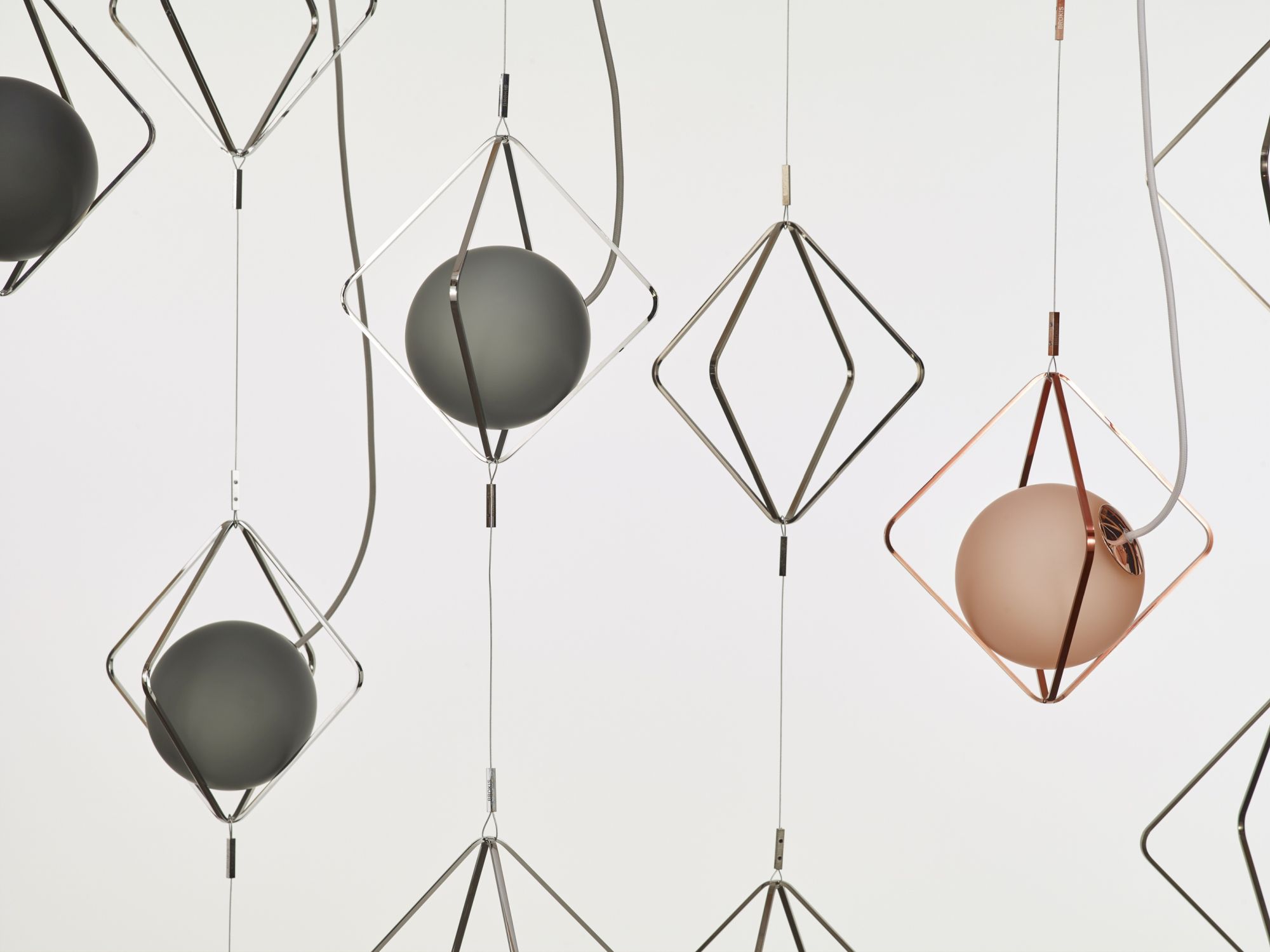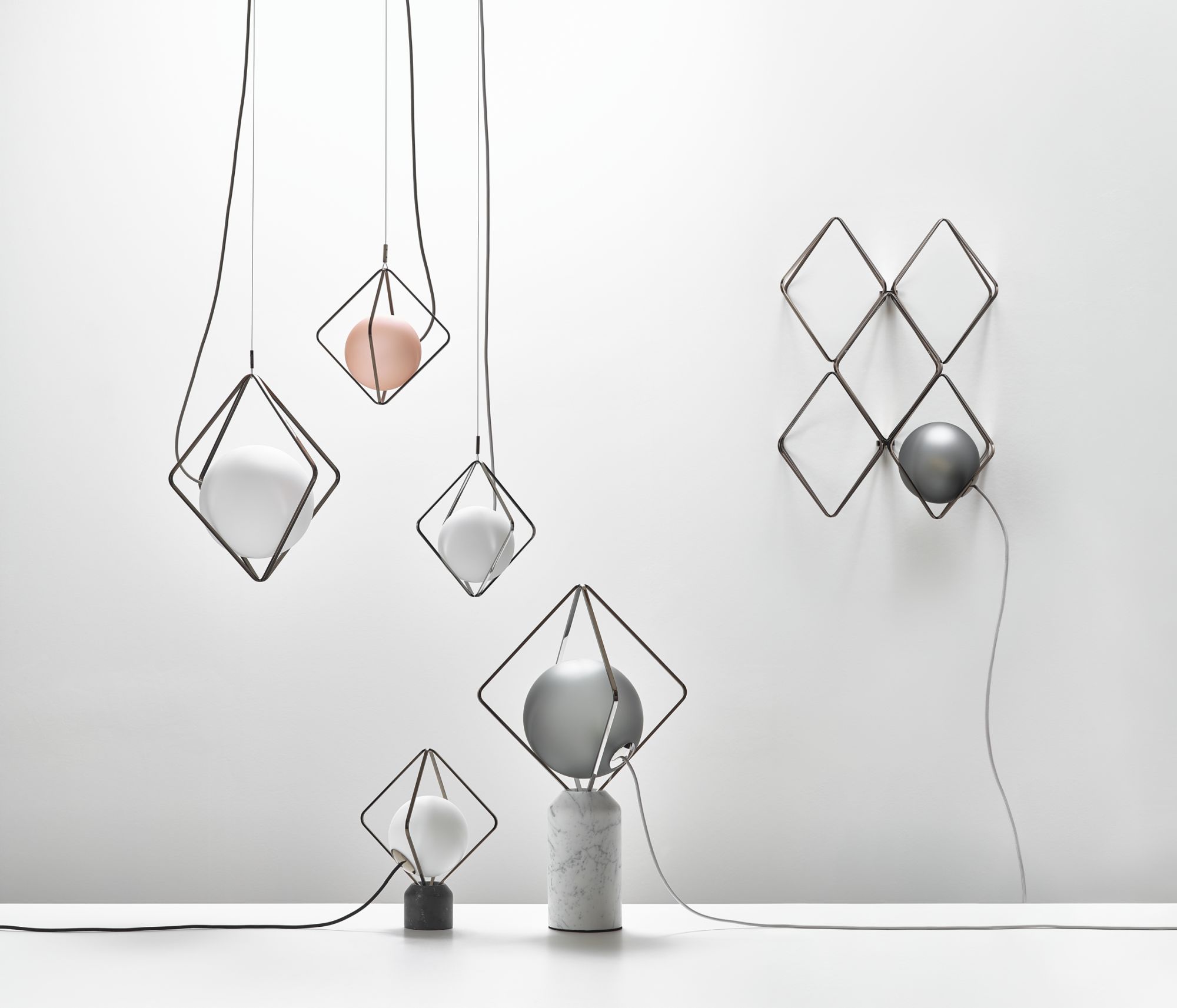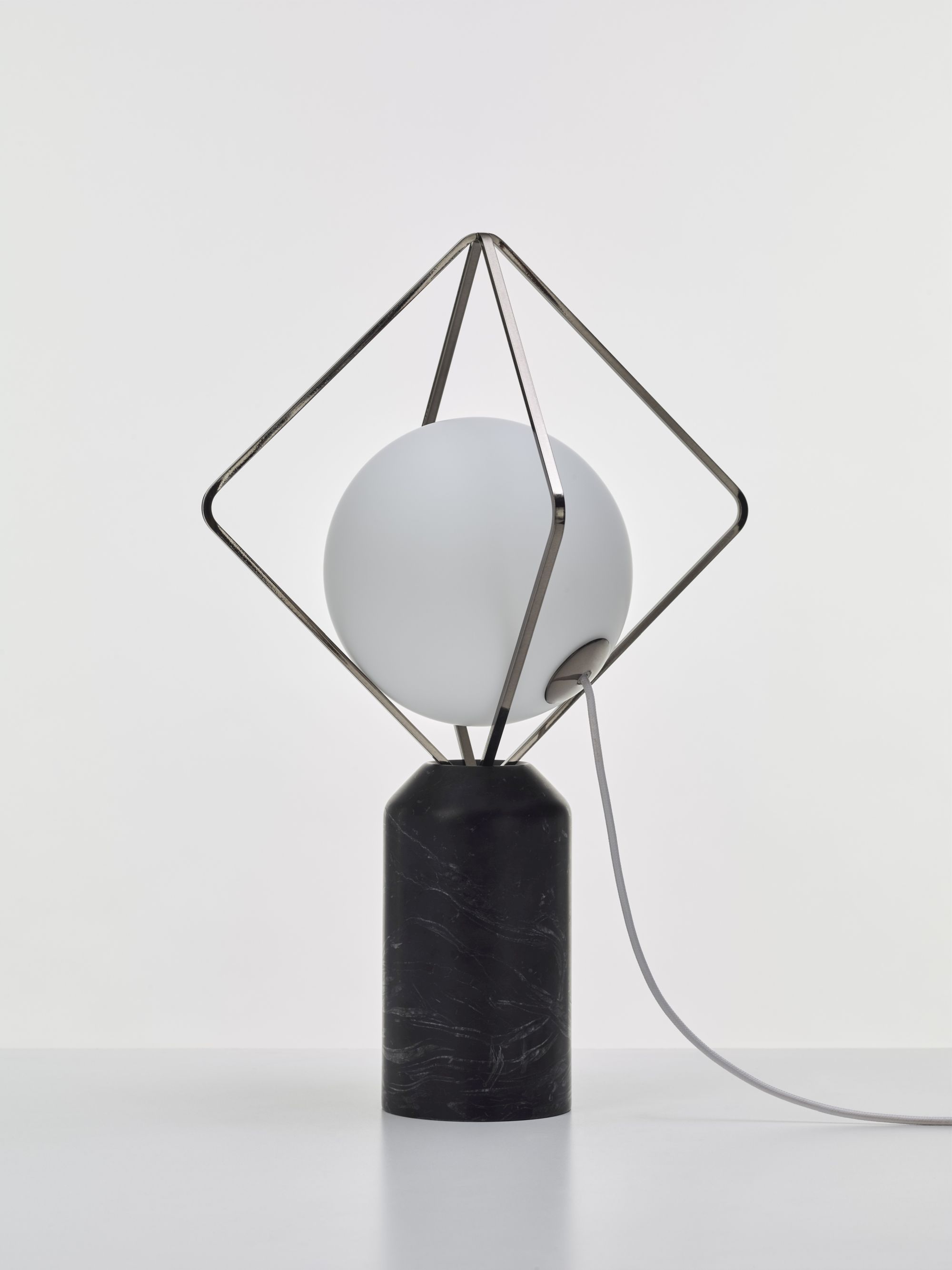 This modern lighting element with marble base, metal frames and a “pearl” placed inside, designed by Lucie Koldova, rounds out the variable Jack O’Lantern family. The new table version combines the beauty of handblown acid etched glass in smoke grey, light pink or triplex opal colours with marble base Carrara or Satinated nero marquinia, in frames with copper, chrome or chrome black liquid metal coating.