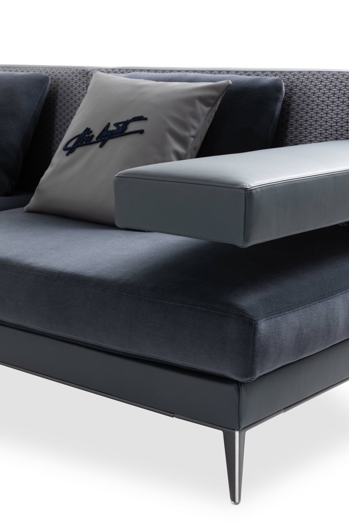 The dorsal fin of the iconic Voiture Noire provided the inspiration for the foot of the modular Flow sofa, which features an aluminium base in Steel Blue or Titanium Silver colour. The armrest defies the force of gravity, highlighting its Bugatti reminiscences, resulting in an exquisitely designed, dynamic product.