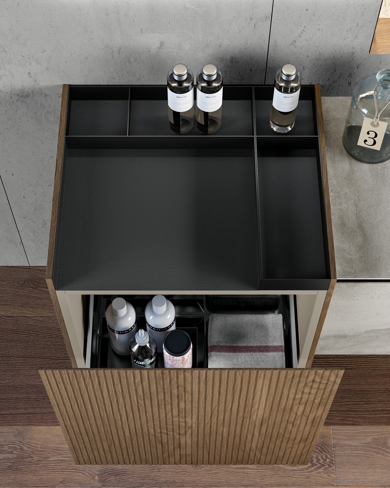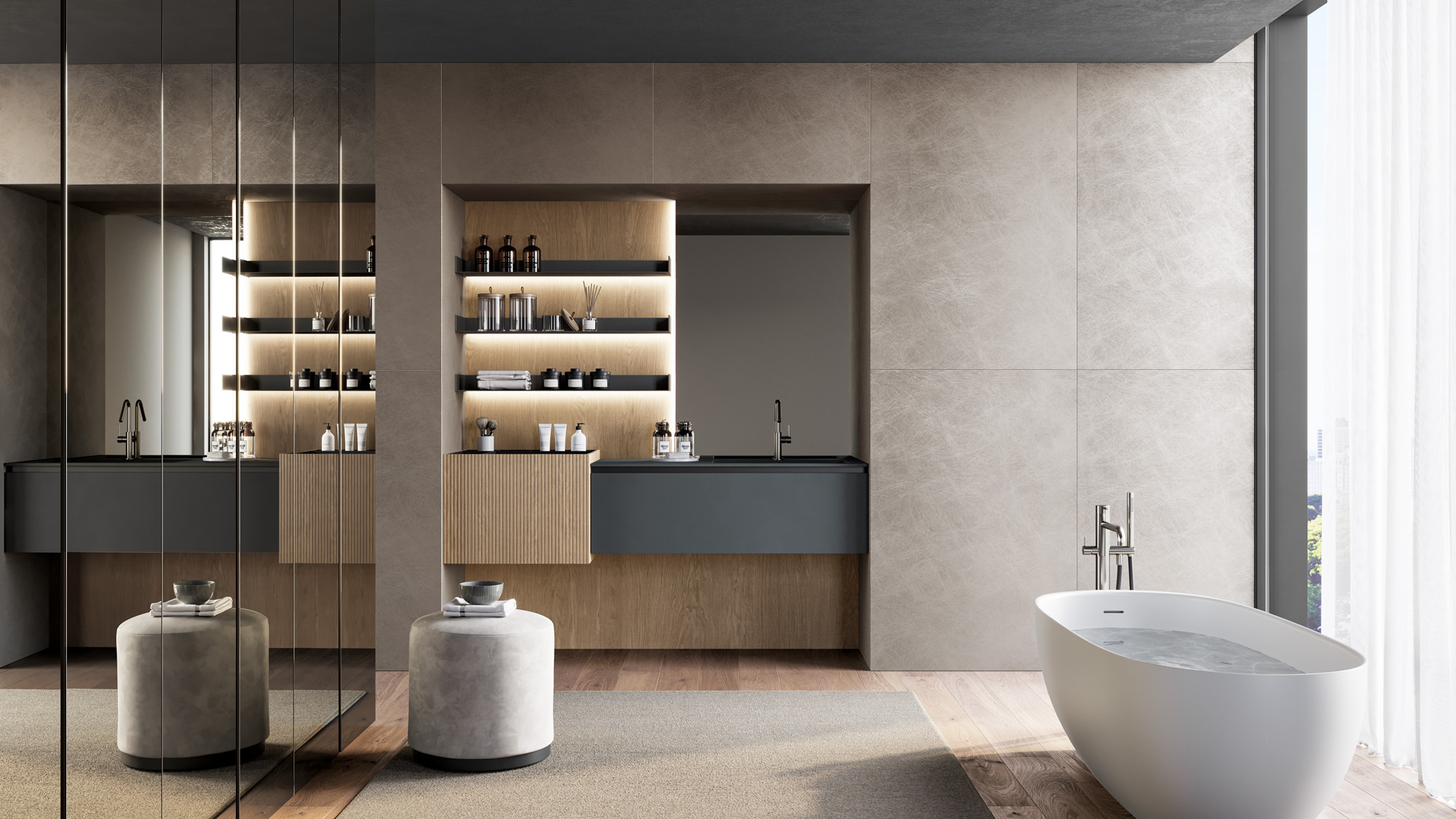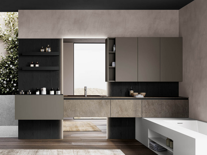 Birex modern bathroom furniture with a strong visual impact. Organisation and rationality are guaranteed by the one-piece element, which stands as the true protagonist of the entire collection. A combination of aesthetics and functionality that plays with modularity and volumes.