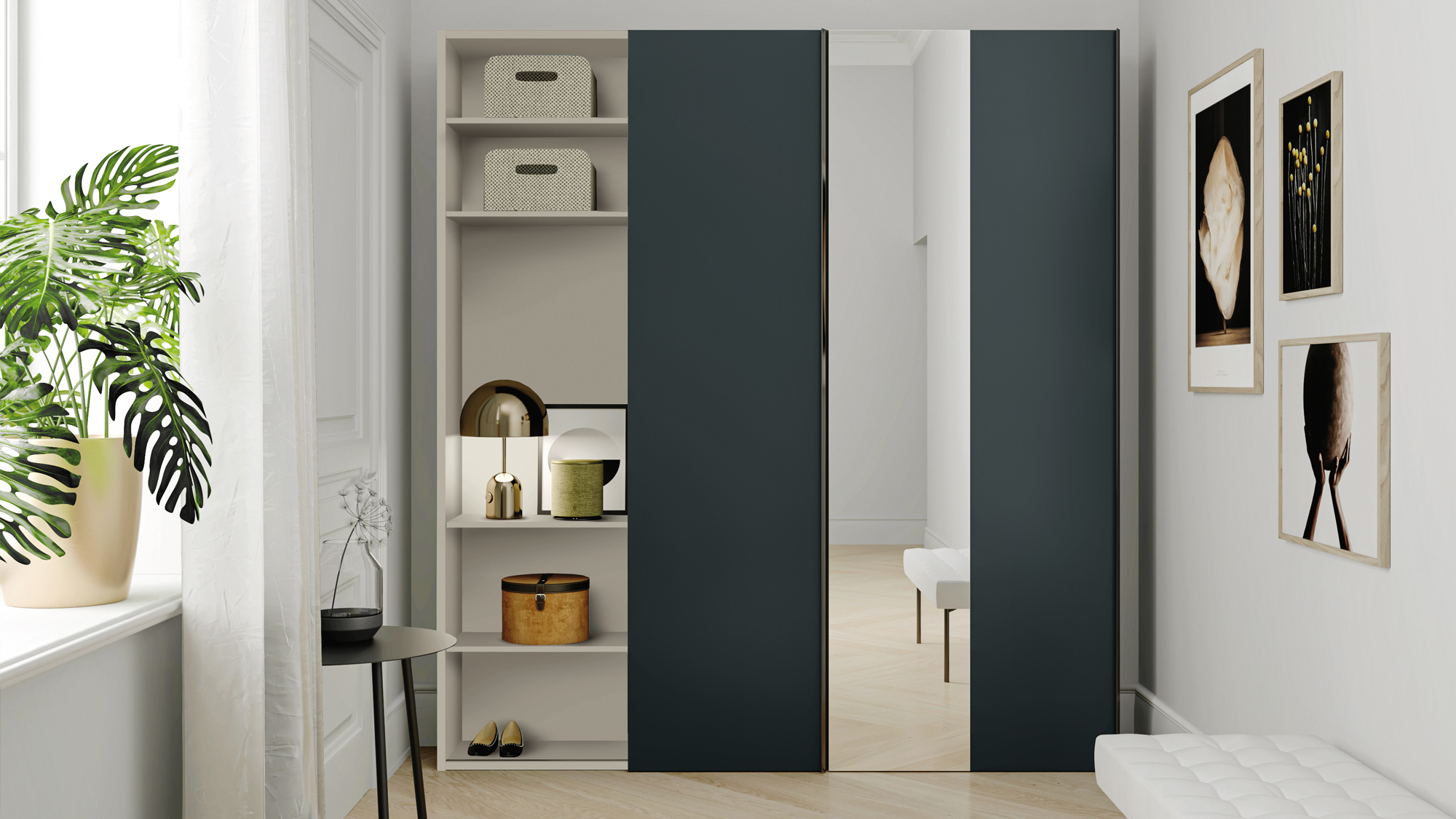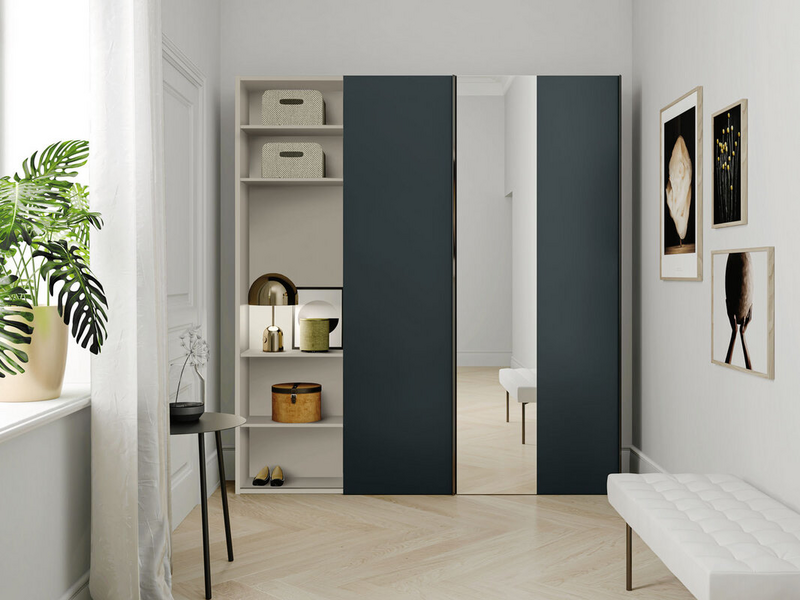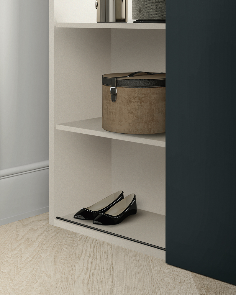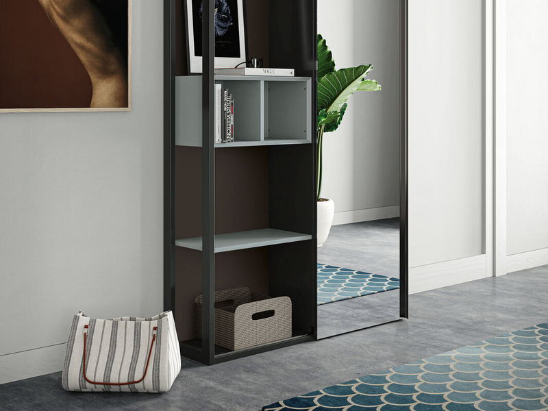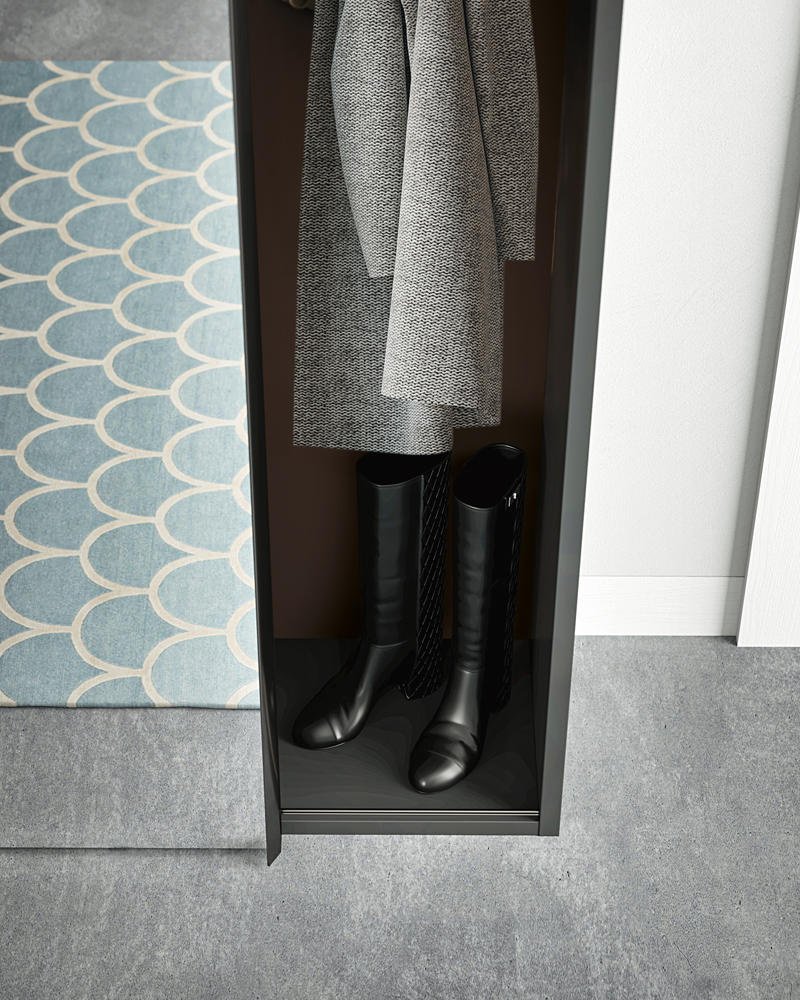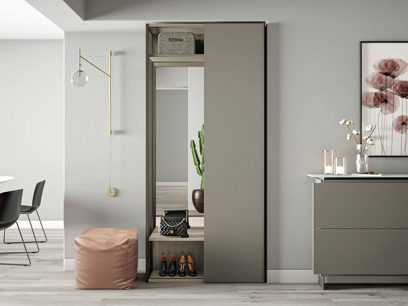 An entrance cabinet conceived as a single wardrobe unit, yet space-saving, thanks to its depth of only 35 centimetres. Its harmonious and well-balanced impact is due to its light and modern design, between full vertical lines, designed by sliding doors, and airy open compartments.