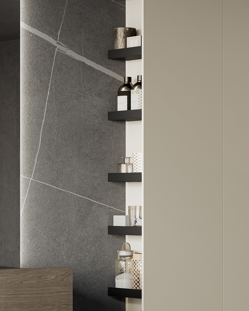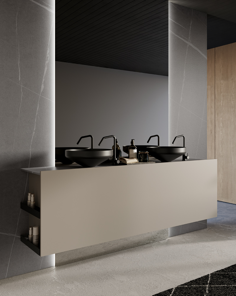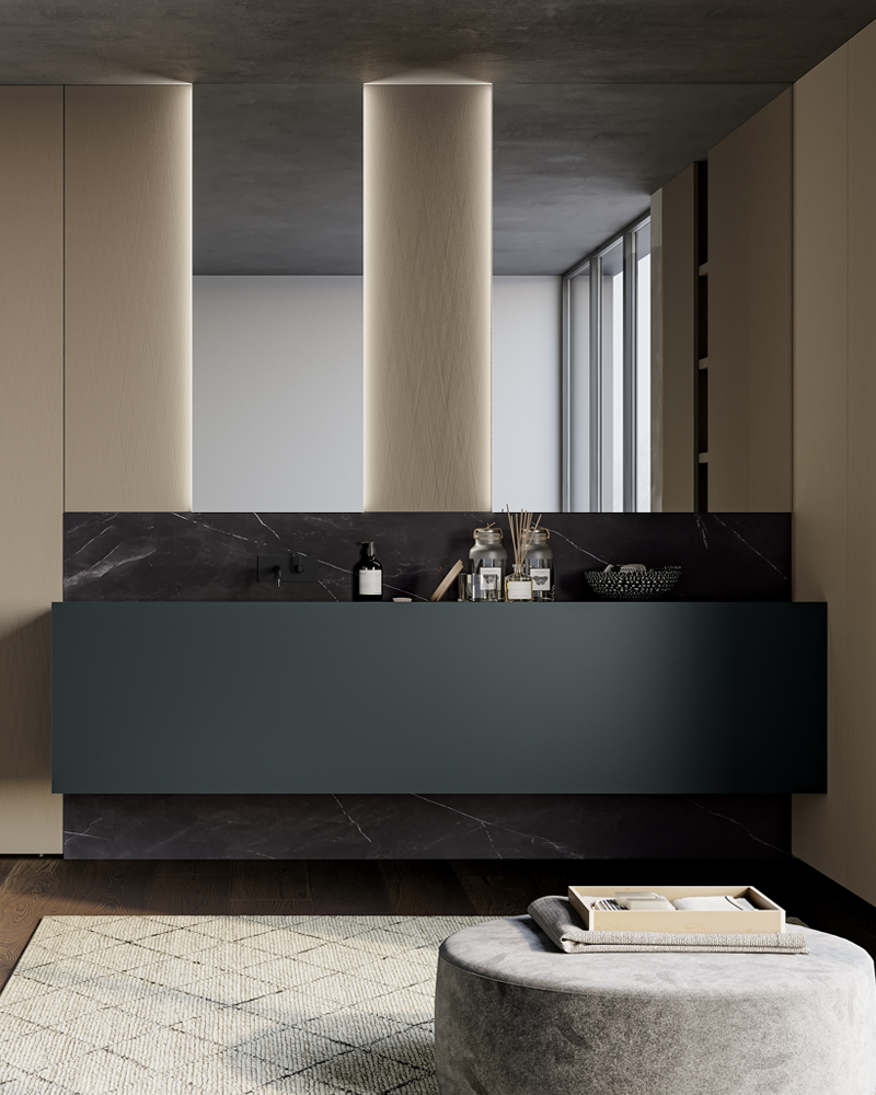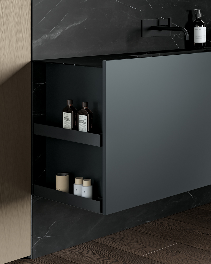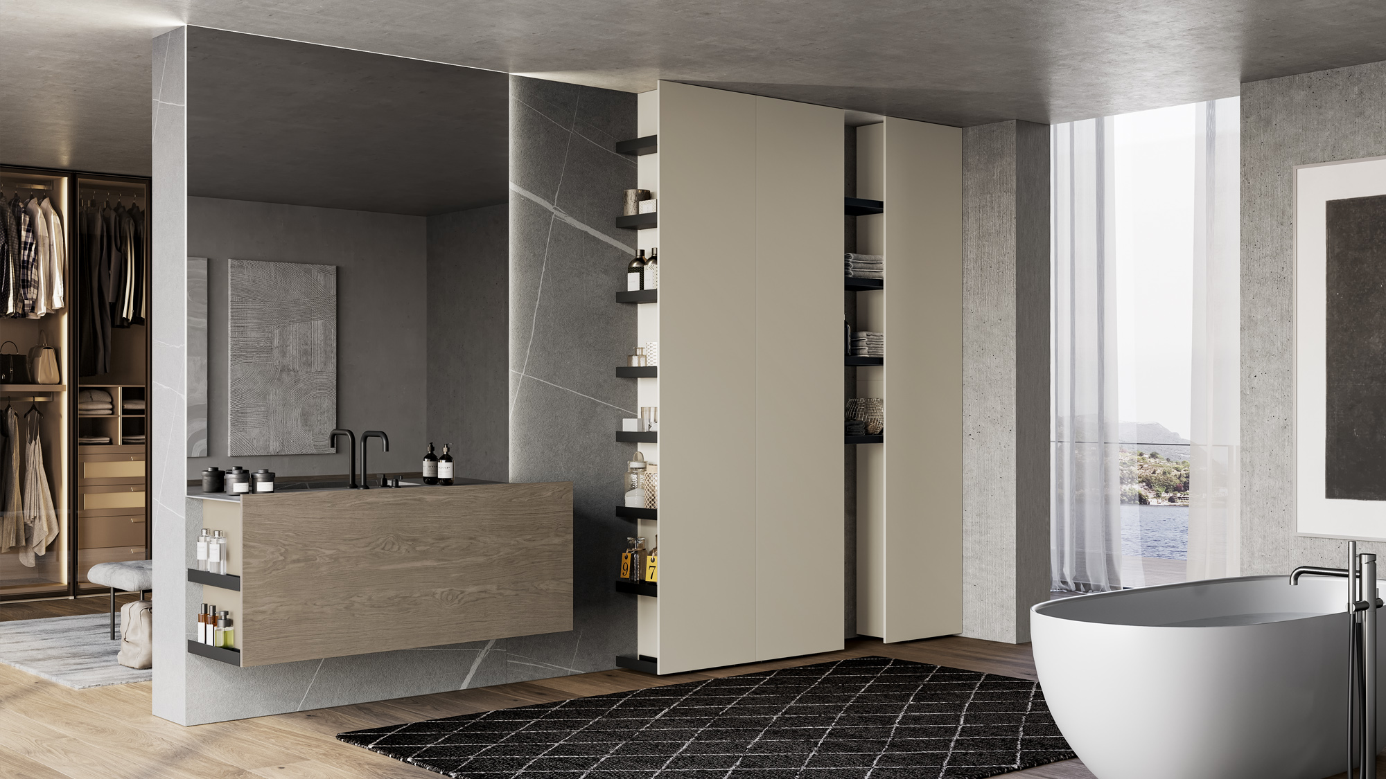 Essential refinement concentrated in a winning combination of storage and aesthetic elegance. The contemporary design bathroom furniture Sail stands out for its unconventional use of geometry, thanks to the projecting doors that draw new functional volumes.