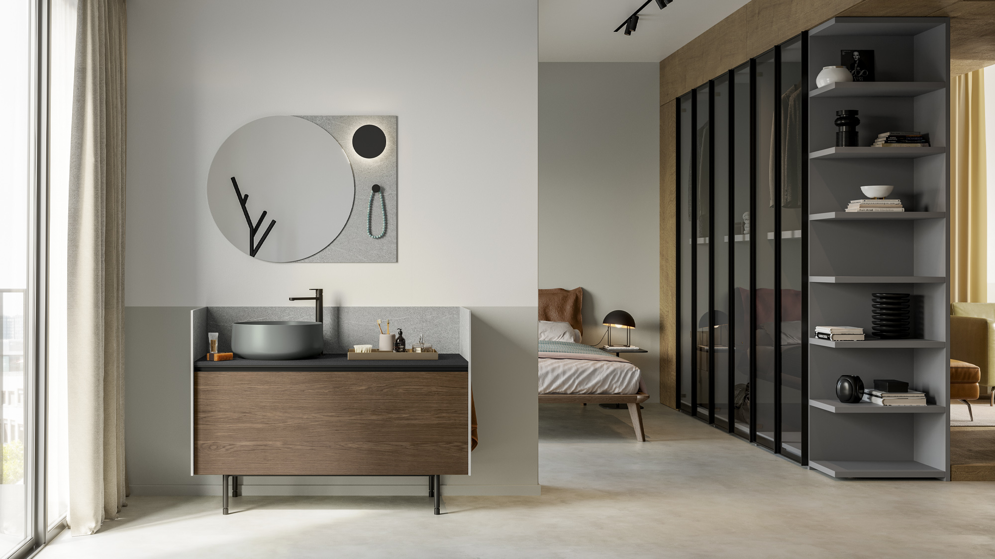 Perfect as a suspended bathroom furniture, which can be designed in a wide range of options, but is also remarkable when mounted on a metal base. Its compositional flexibility is unique, developed around three different depths and a magnificent range of finishes.
