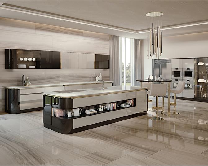 Le superfici possono essere così personalizzate con venature a vista dall’effetto fiammato, per una resa pittorica in contrasto con le forme simmetriche della collezione.
