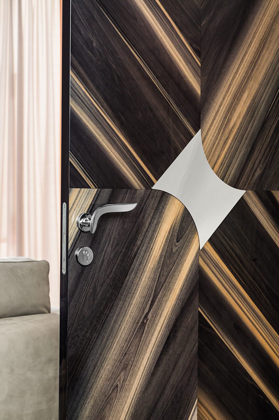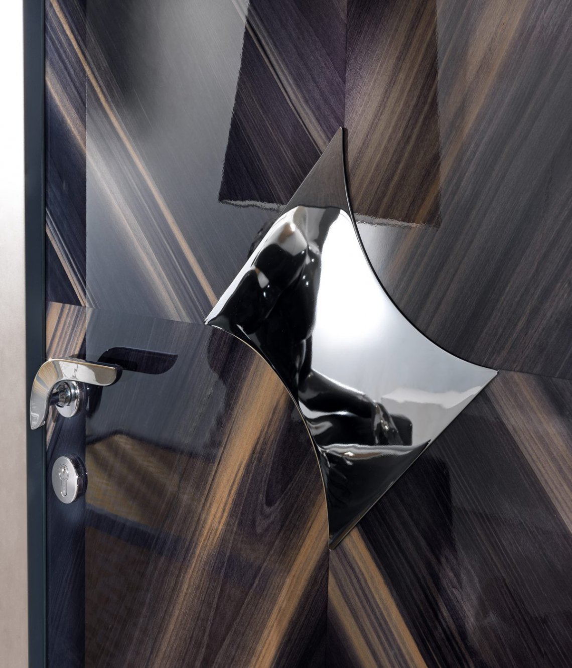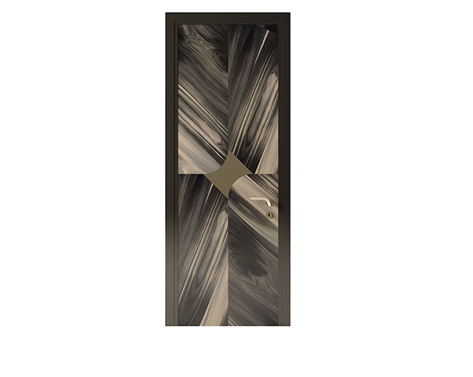 Le superfici possono essere così personalizzate con venature a vista dall’effetto fiammato, per una resa pittorica in contrasto con le forme simmetriche della collezione.