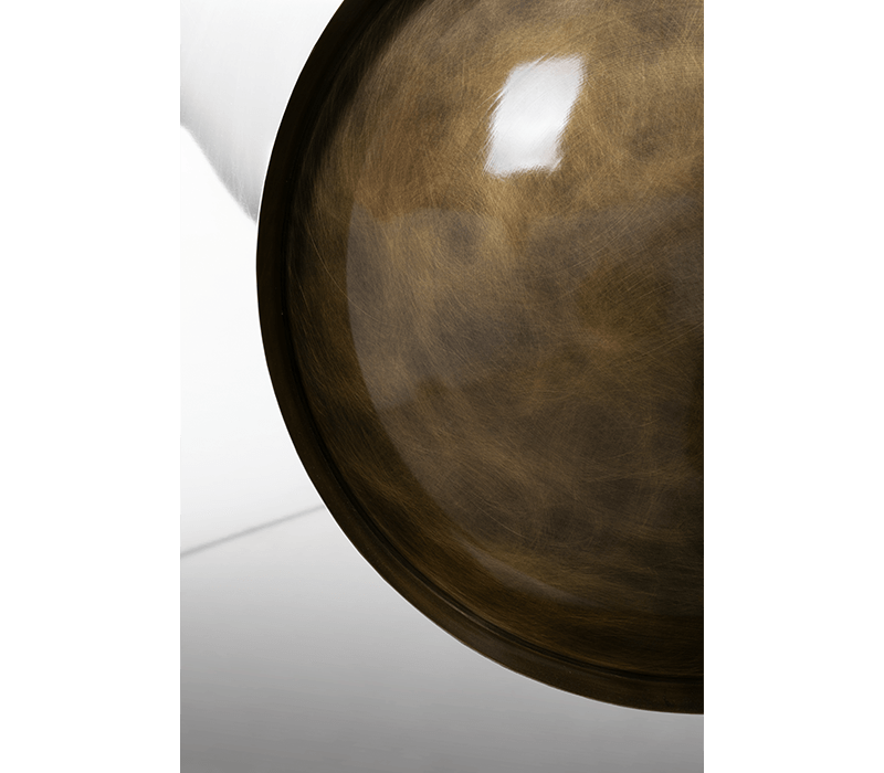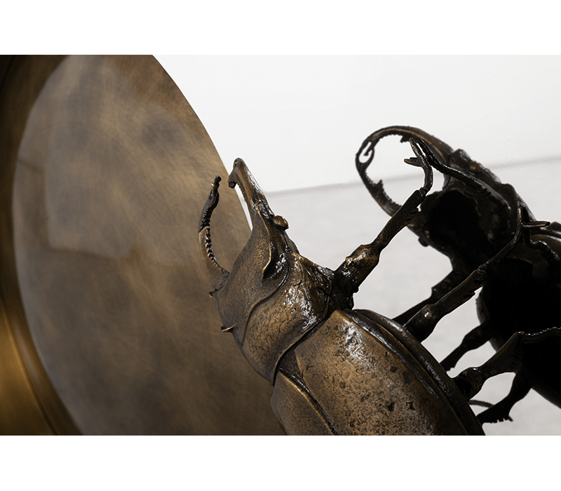 The Metamorphosis console table has come to symbolize the evolutionary history of life, representing the last stage of the cycle through the usage of sculpted fossils on display at the top of the table. This Console embodies handmade techniques such as hammering and polishing, executed by some of the best craftsmen in the country. Strong geometric design is coupled by two brass plated feet with casted brass details. A unique product for those who have a peculiar taste for limited edition pieces and conceptual designs.