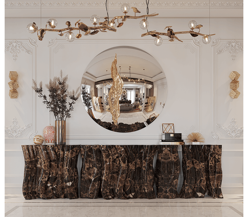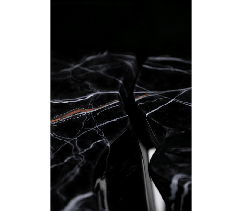 A demonstration of both imagination and strong design skills, the Monochrome console table is a remarkable piece that stands out in any room or setting. Perfect for living spaces grounded in a contemporary style as they embrace careful craftsmanship, this console expresses a leading edge outlook through its daring curvy shapes and dark tones. Carefully built from resin, the Monochrome is composed of three separate modules, embellished with handpainted faux-marble as a result of advanced experimentations, and finished with a high gloss varnish coat. An avant-garde console that conveys a seductive and fearless attitude due to its unique and challenging design.