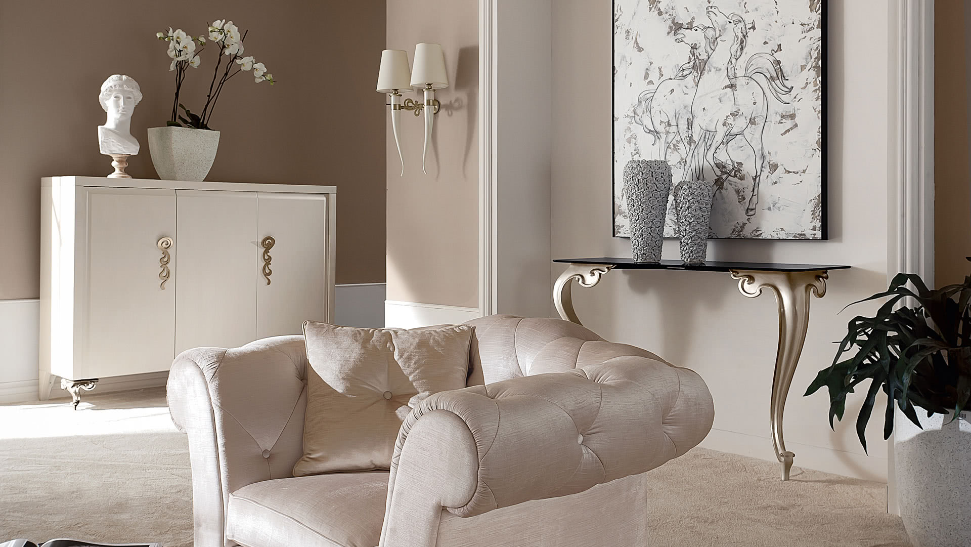 Il vano interno è diviso con ripiani in vetro molato a filo lucido. Dalla linea pulita e rigorosa del mobile risaltano i piedi, in alluminio pressofuso e decorato in foglia, e le maniglie, in ferro tagliato a laser, curvate e levigate artigianalmente in galvanica.