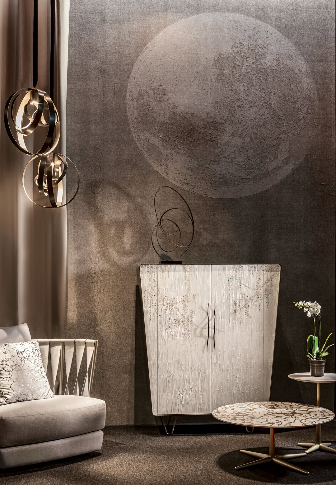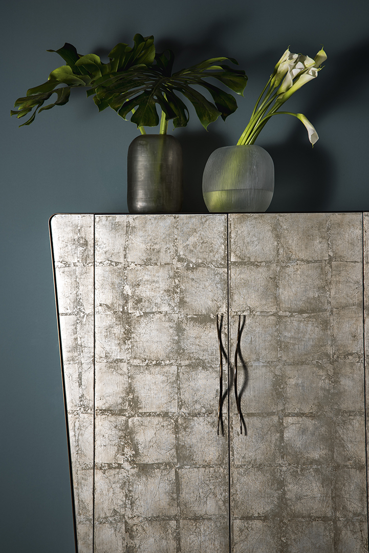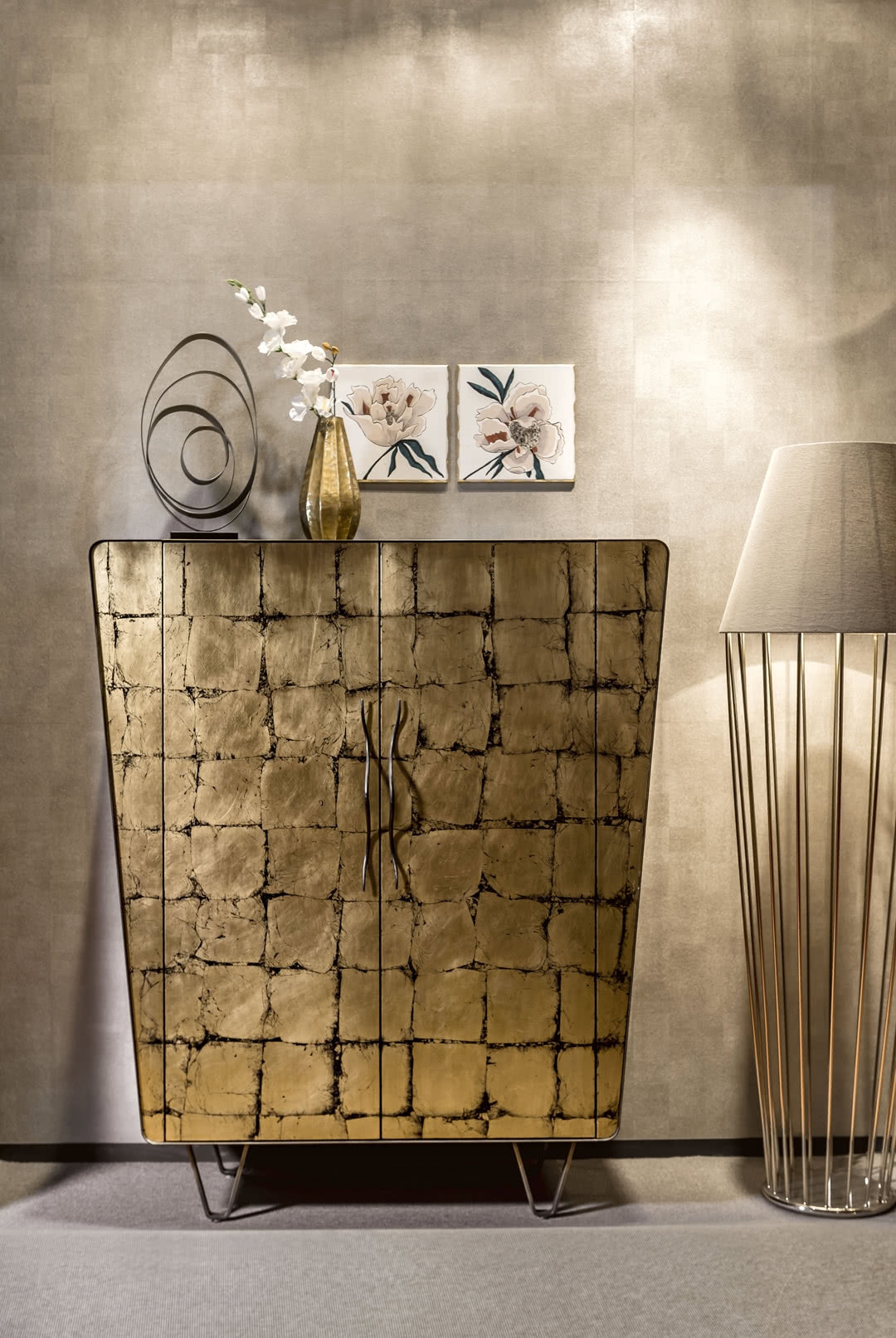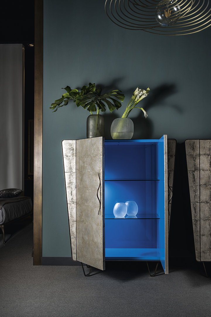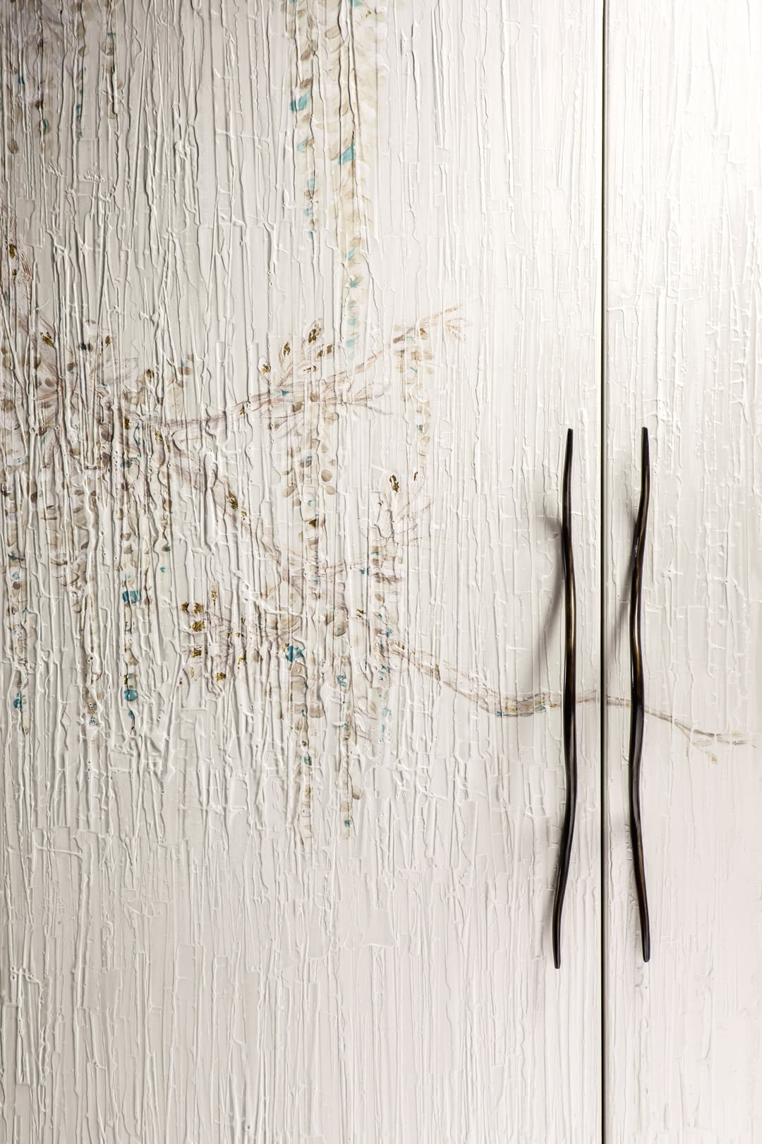 Feet and handles made with shaped steel rod. The matt lacquered interior can be customized in the colours, while there are three available decorations for the front: "wisteria", "vintage" gold leaf, "storm". The vintage gold leaf decoration is created by hand, applying one entire piece of gold leaf on a dark bronze coat. Although it may seem randomly applied, the decoration is in truth very accurate; the gold leaf is a thin layer laid very gently and with great aesthetic sensitivity, to give the right light between one layer and the other. In the “wisteria” decoration liquid chalk is carefully poured on the light coat. Next step: wisteria flowers and branches are painted by hand on the mother-of-pearl base coat, fllowing the pattern previously created. Chalk, acrylic paint and spatula are the elements of the “storm” decoration: combined together they create an impressive three-dimensional effect. A revival of decorative style that characterized Art Deco. The cabinet’s front becomes a real painting through a bas-relief. The colours, thickened with chalk and spread with a spatula for the coating and with a brush for the small parts, create this fine, delicate decoration.