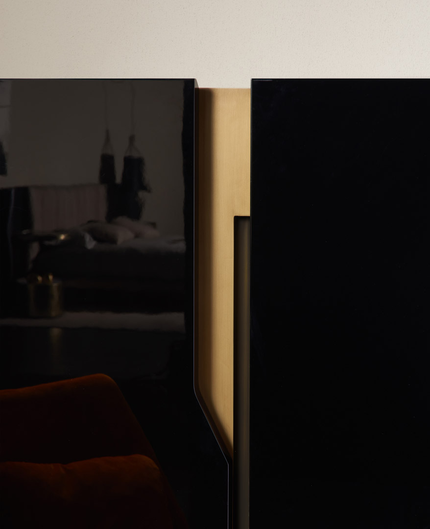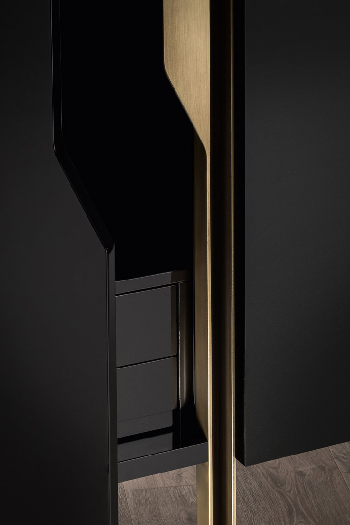 The exterior lacquered-wood structure and the metal base make a perfect match. The base obtained from a single metal block that has been hollowed out and hammered on the inside, is joined with the structure, creating a unique and refined decorative effect. The inside is divided up by a glass shelf and 4 drawers which match the exterior finishing. The Mirage sideboard, with its simple lines and eye-catching design, stands out in any context.