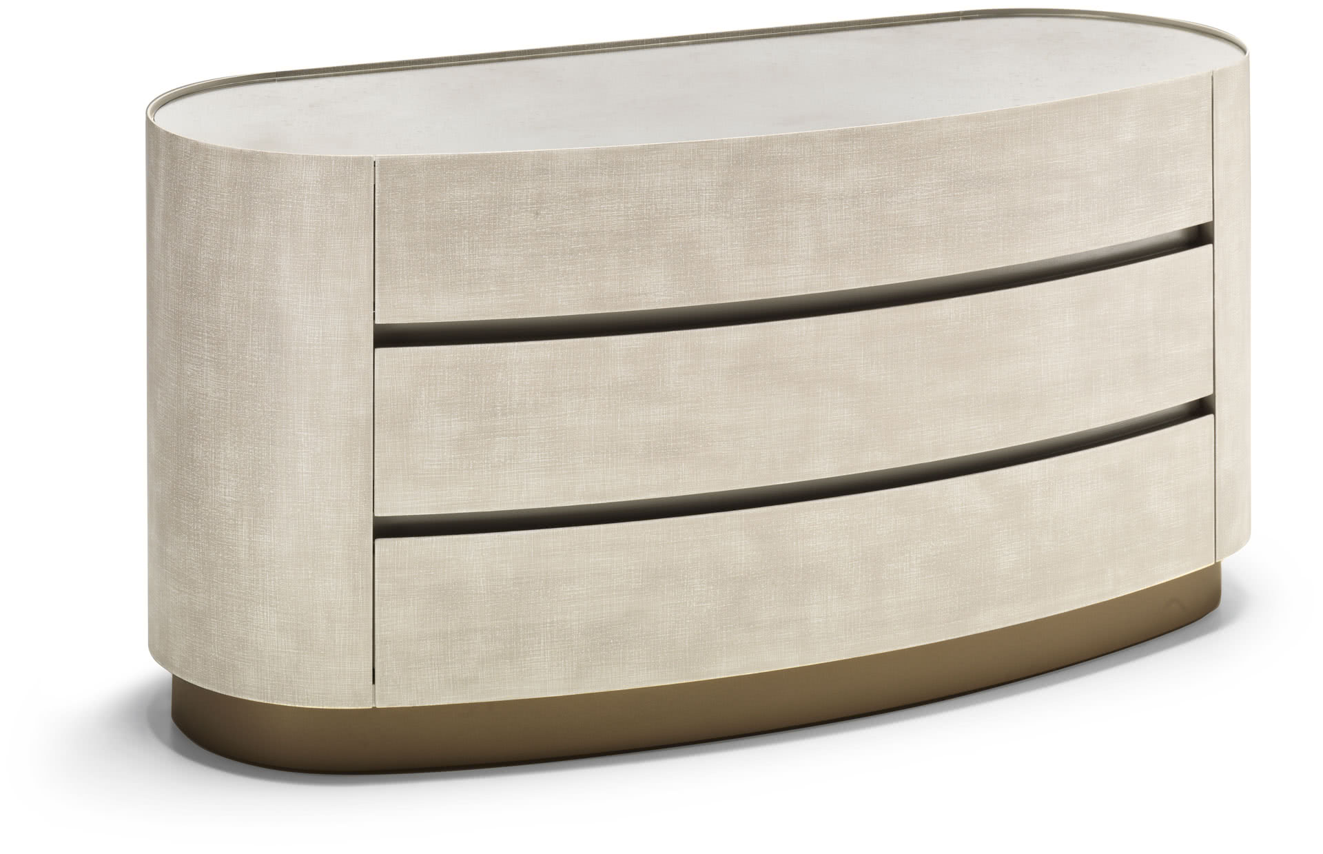 La base, con 3 cassetti a scomparsa, è decorata in bronzo mentre il top è realizzato in specchio fumé bronzo. Un comò dal design moderno e pulito che, insieme ai comodini, crea un gruppo notte elegante e unico.