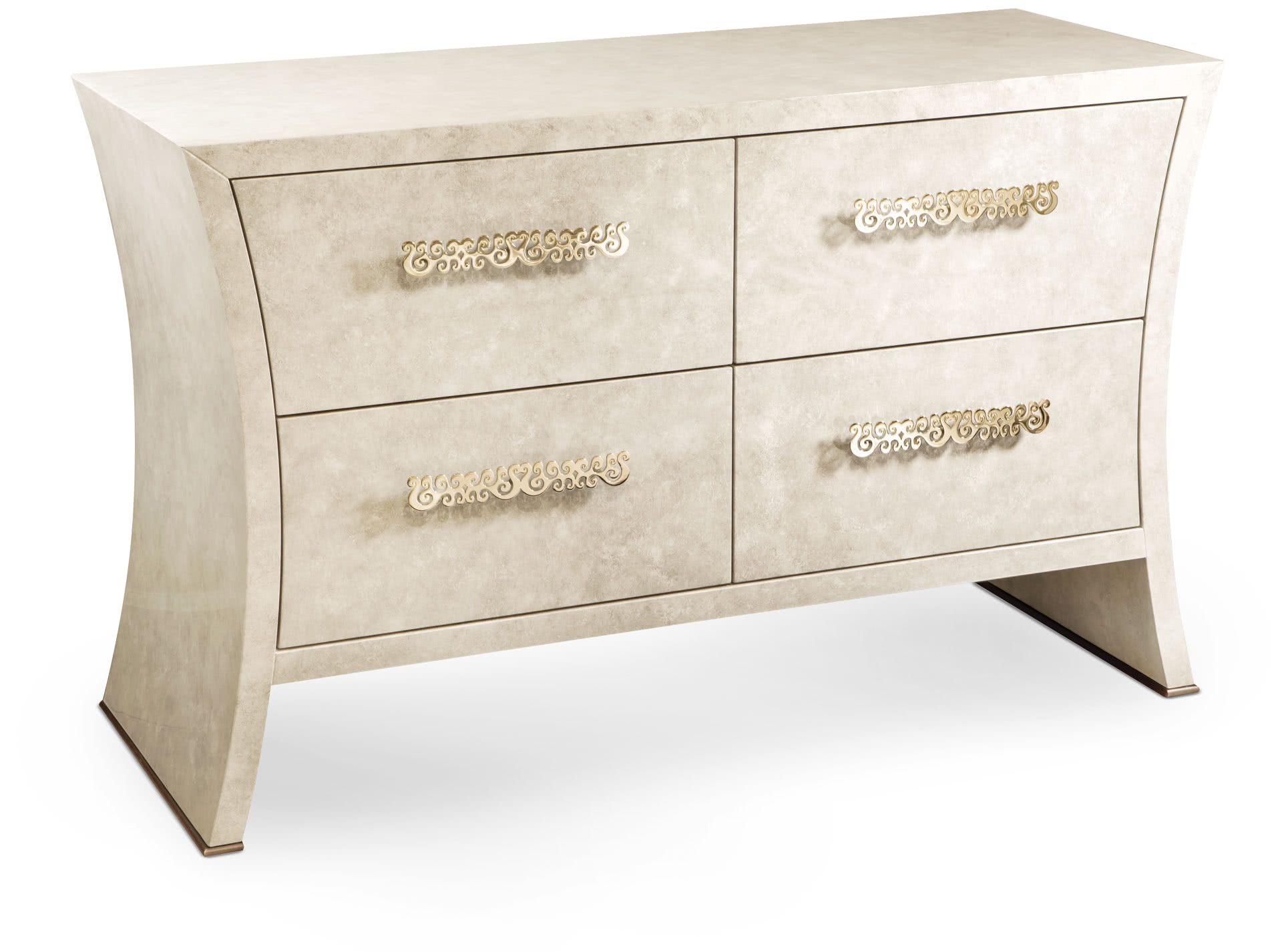 La struttura, in legno curvato e sagomato, è realizzata in madreperla spatolato o nella nuova finitura seashell, che dona luminosità alla struttura dalle forme sinuose. I quattro cassetti presentano delle maniglie tagliate a laser in oro pallido; la base è disponibile in bronzo. Il comò Richard, insieme ai comodini, crea un gruppo notte elegante e unico.