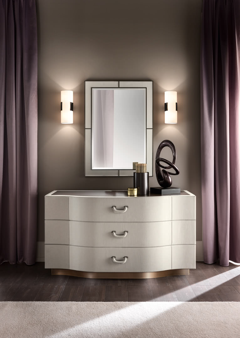Il piano è sagomato e la base è realizzata in bronzo. Le maniglie dal sapore vintage, che ricordano le valige di lusso, sono rivestite in pelle con dettagli in metallo. Le forme sinuose e armoniose, insieme alla ricercatezza dei materiali e all'abbinamento con i comodini, creano un gruppo notte elegante e unico.
