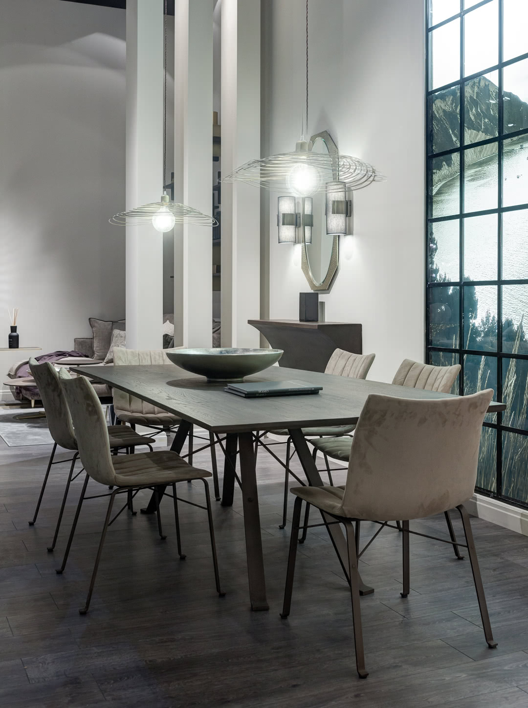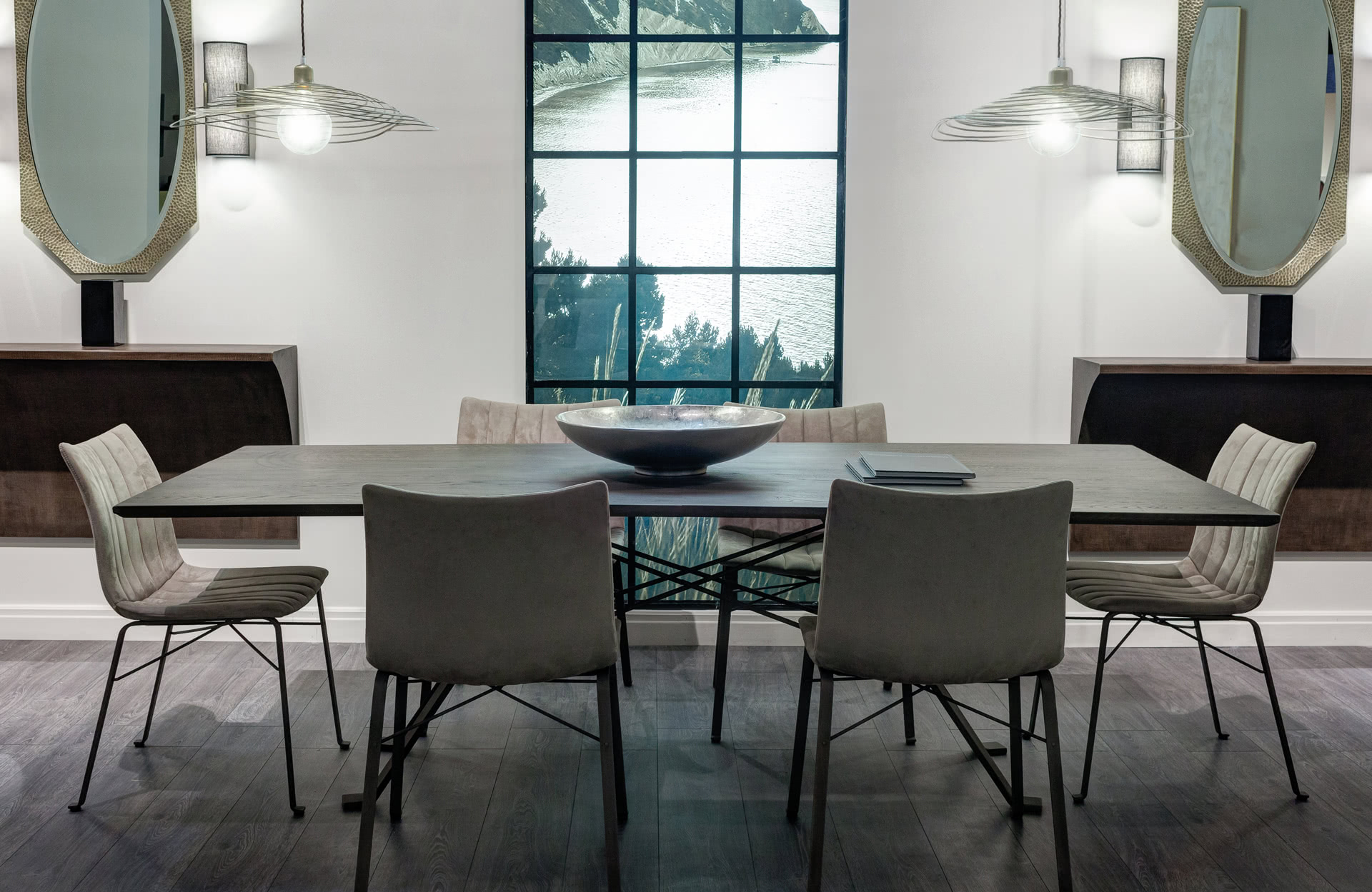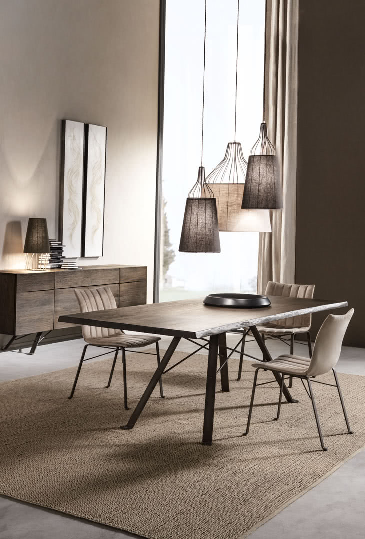 Il piano di questo tavolo moderno in massello di rovere carbon o naturale è smussato irregolarmente mentre il telaio, in ferro pieno, è curvato e rastremato dalla struttura a traliccio.