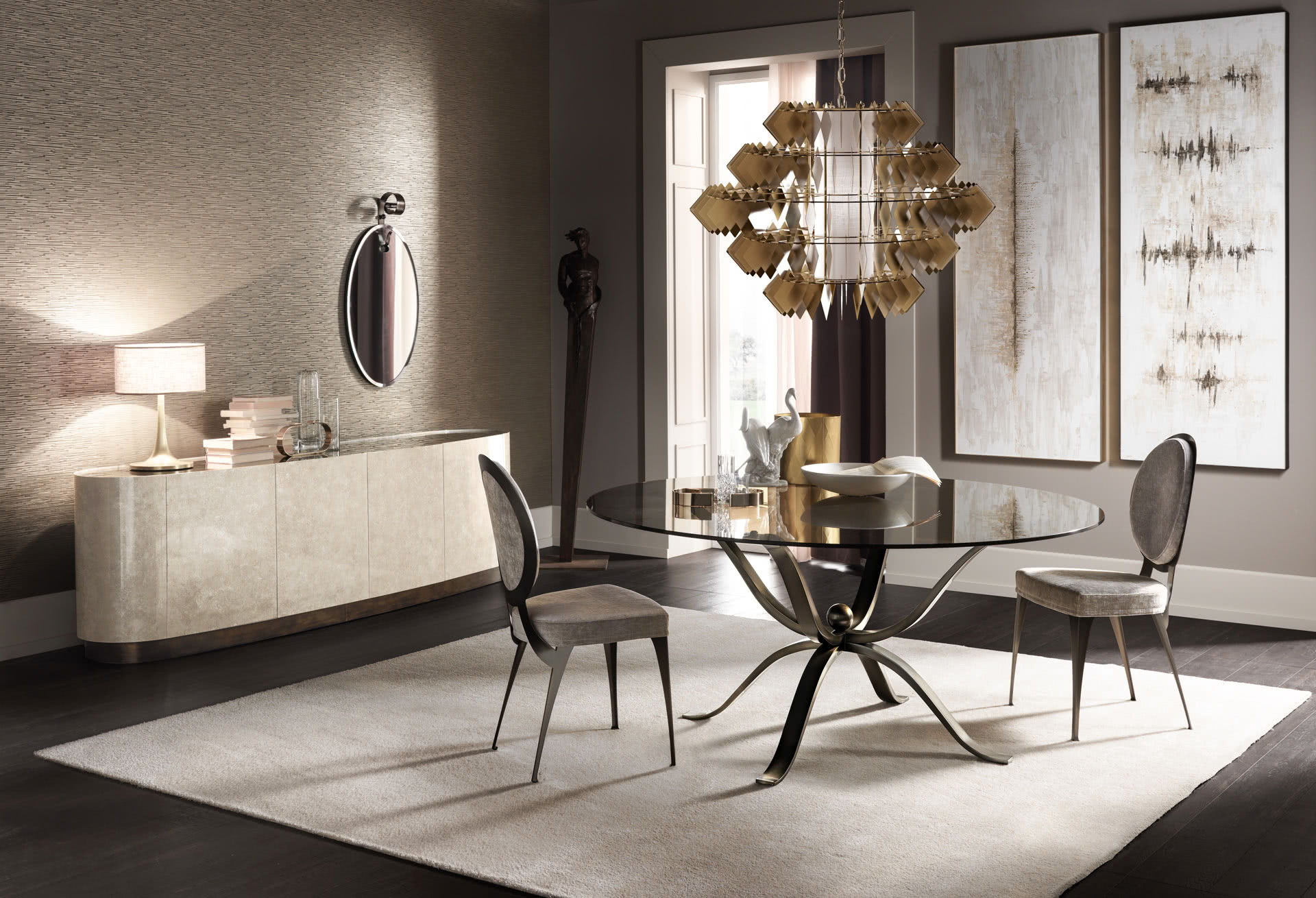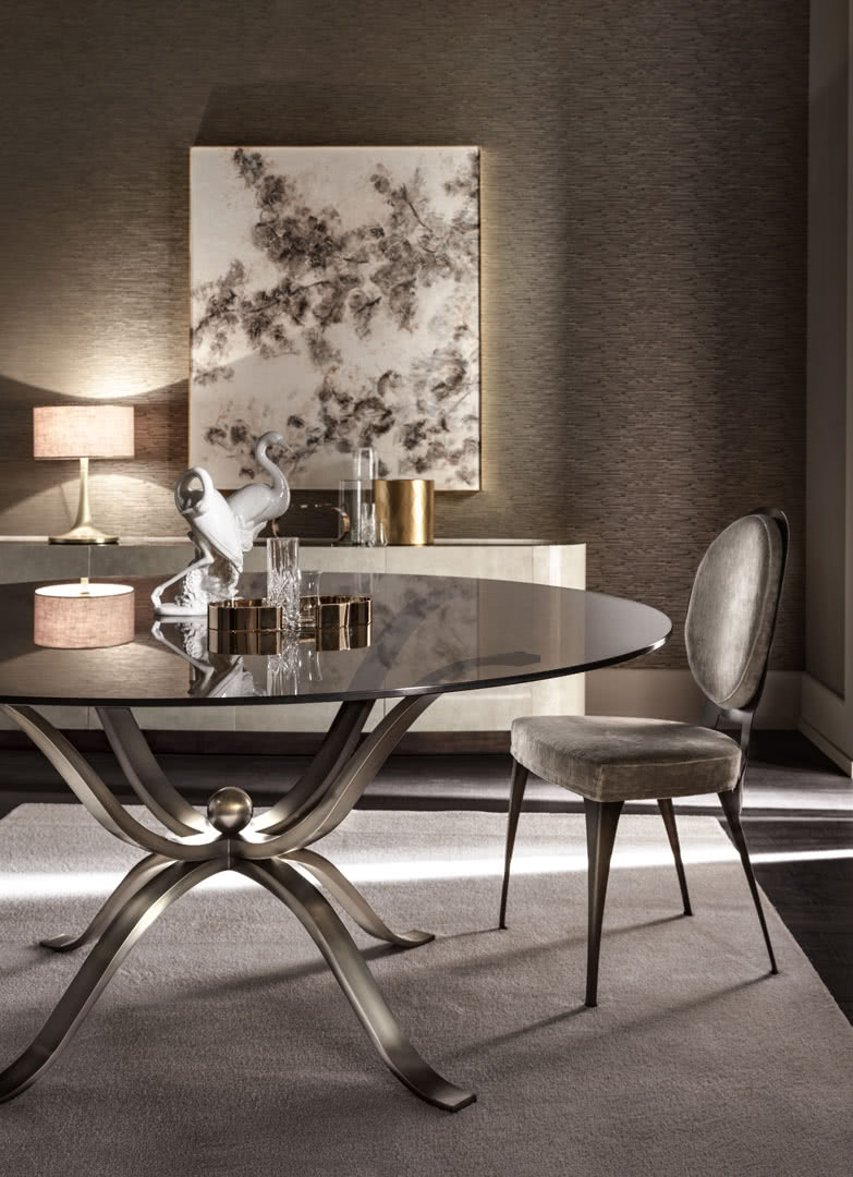 Il top in vetro è disponibile in vetro trasparente o bronzato con bordo molato o a filo lucido. La struttura portante, realizzata in ferro pieno, viene rastremata, curvata a freddo e lucidata a mano.