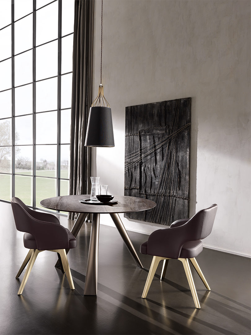 I piedi in metallo, modellati e levigati manualmente, sono schiacciati alla base in modo da slanciare e alleggerire il piano in marmo o in ceramica. Linee e materiali moderni per un tavolo dal design lineare.