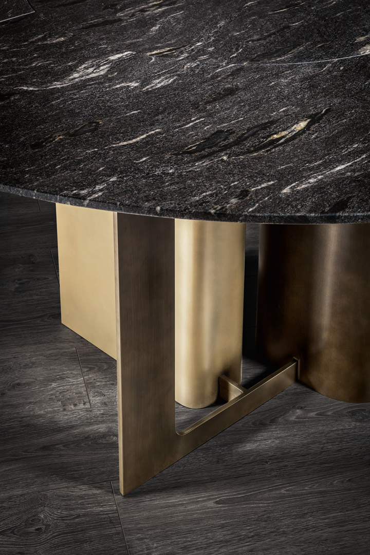Il basamento è in ferro curvato e sagomato, decorato in bronzo con toni chiari e scuri. Il sotto top è in legno verniciato nero goffrato, mentre il piano è in marmo a 5 sezioni differenti. Perfetto per colazioni di lavoro e pranzi sofisticati grazie alla Lazy Susan integrata (piano centrale girevole). Il tavolo Mirage, con il design originale della base che mostra pieni e vuoti a secondo del punto di vista, è perfetto per ogni stile di sala da pranzo.