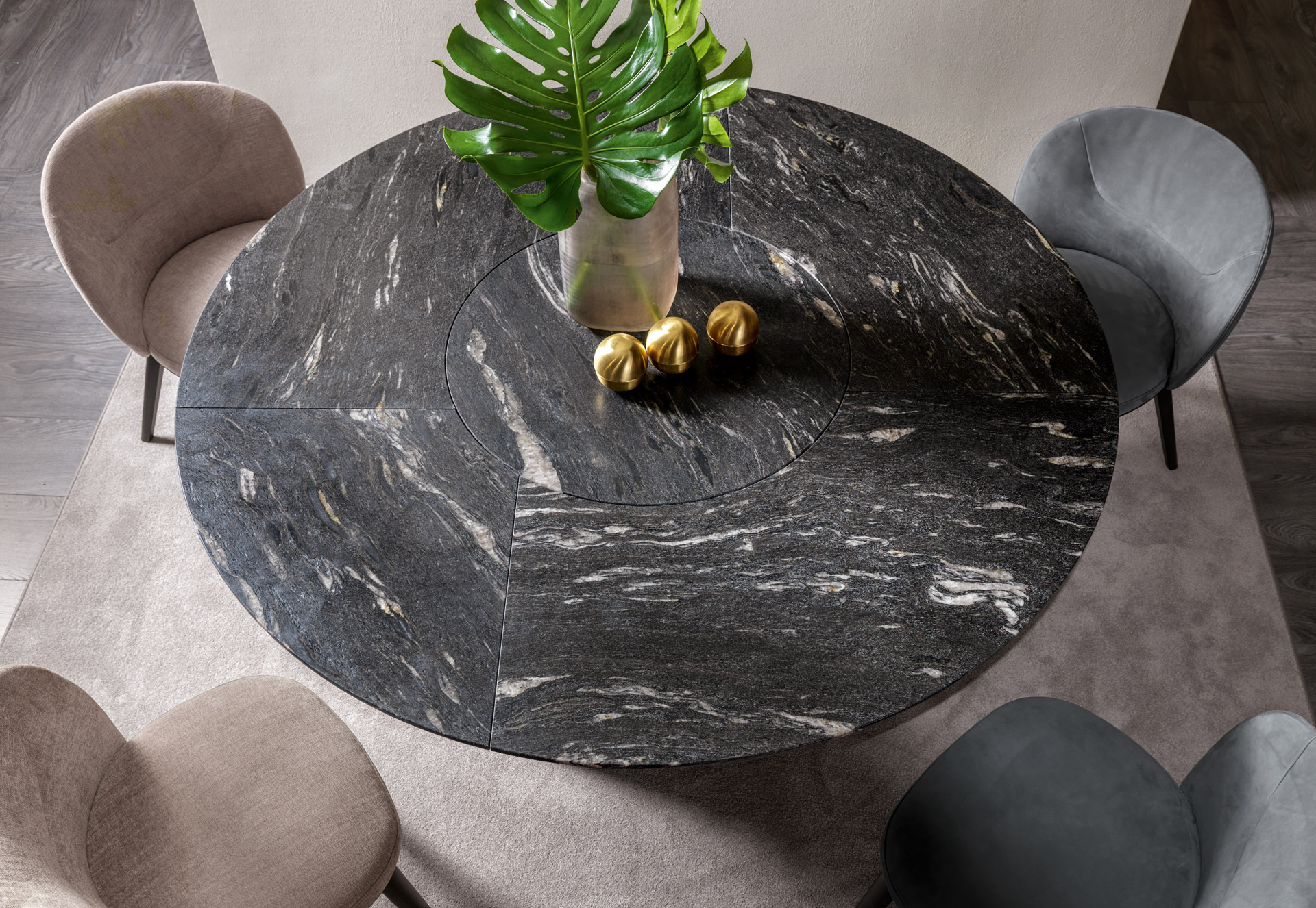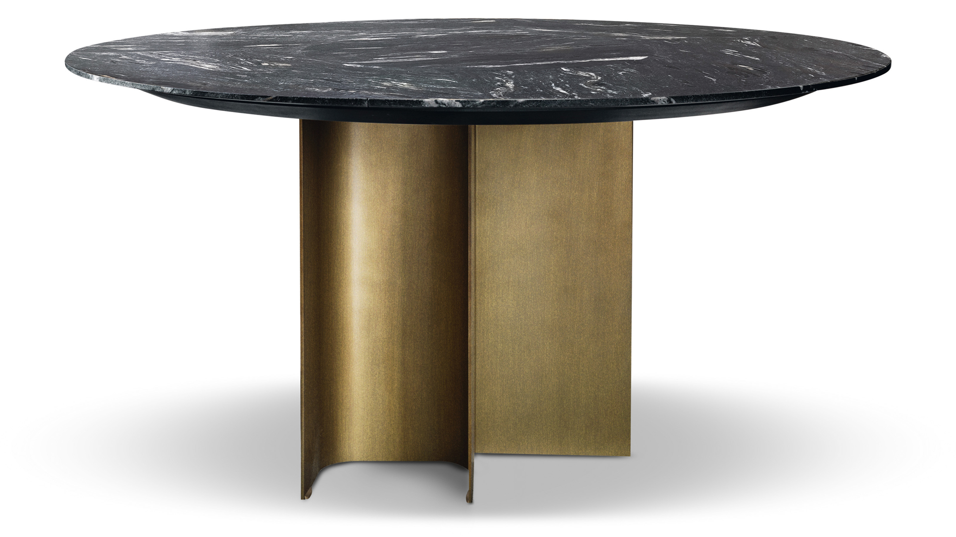 Tavolo rotondo Mirage in legno, metallo e marmo.