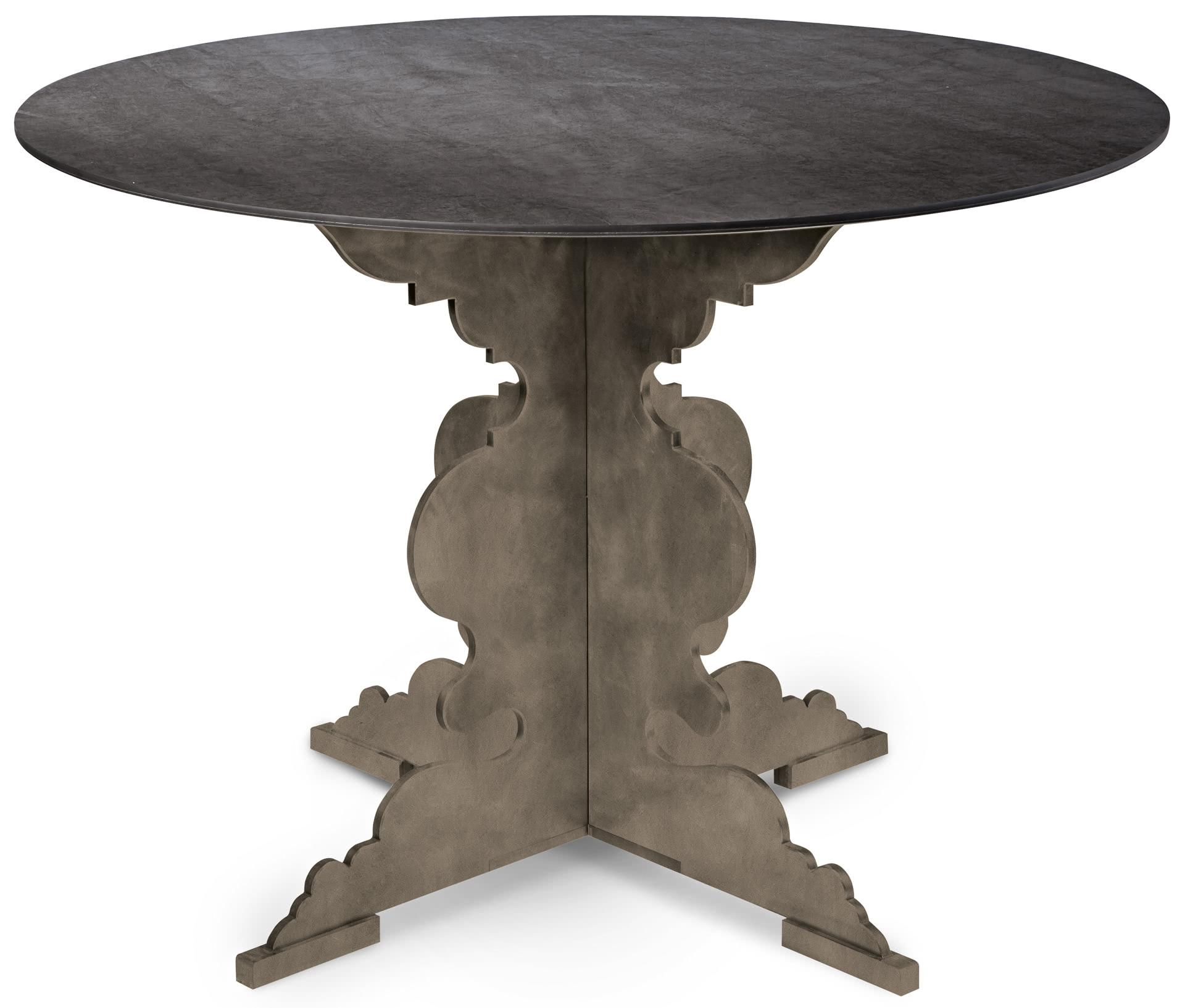 Il top è disponibile in ceramica o in massello di legno rovere, invecchiato e patinato a mano. La base centrale, in metallo pieno, è sagomata al laser, saldata a filo e levigata manualmente per dare vita alla tridimensionalità delle sue forme sinuose. Un romantico esercizio di design.