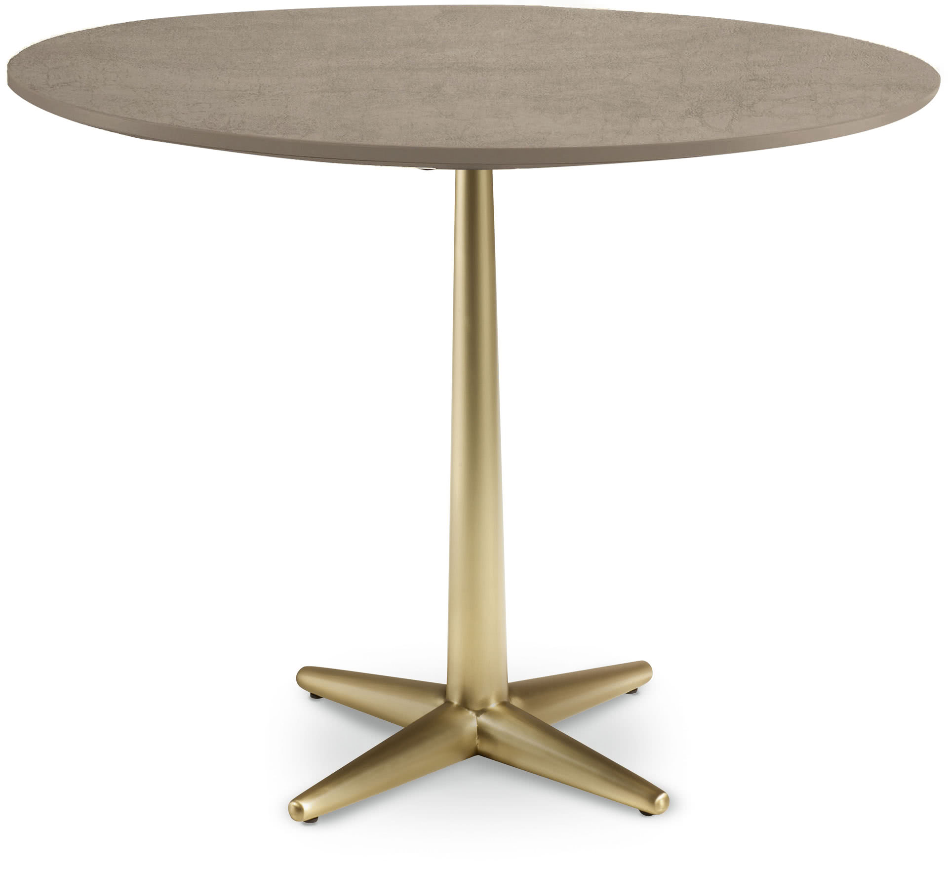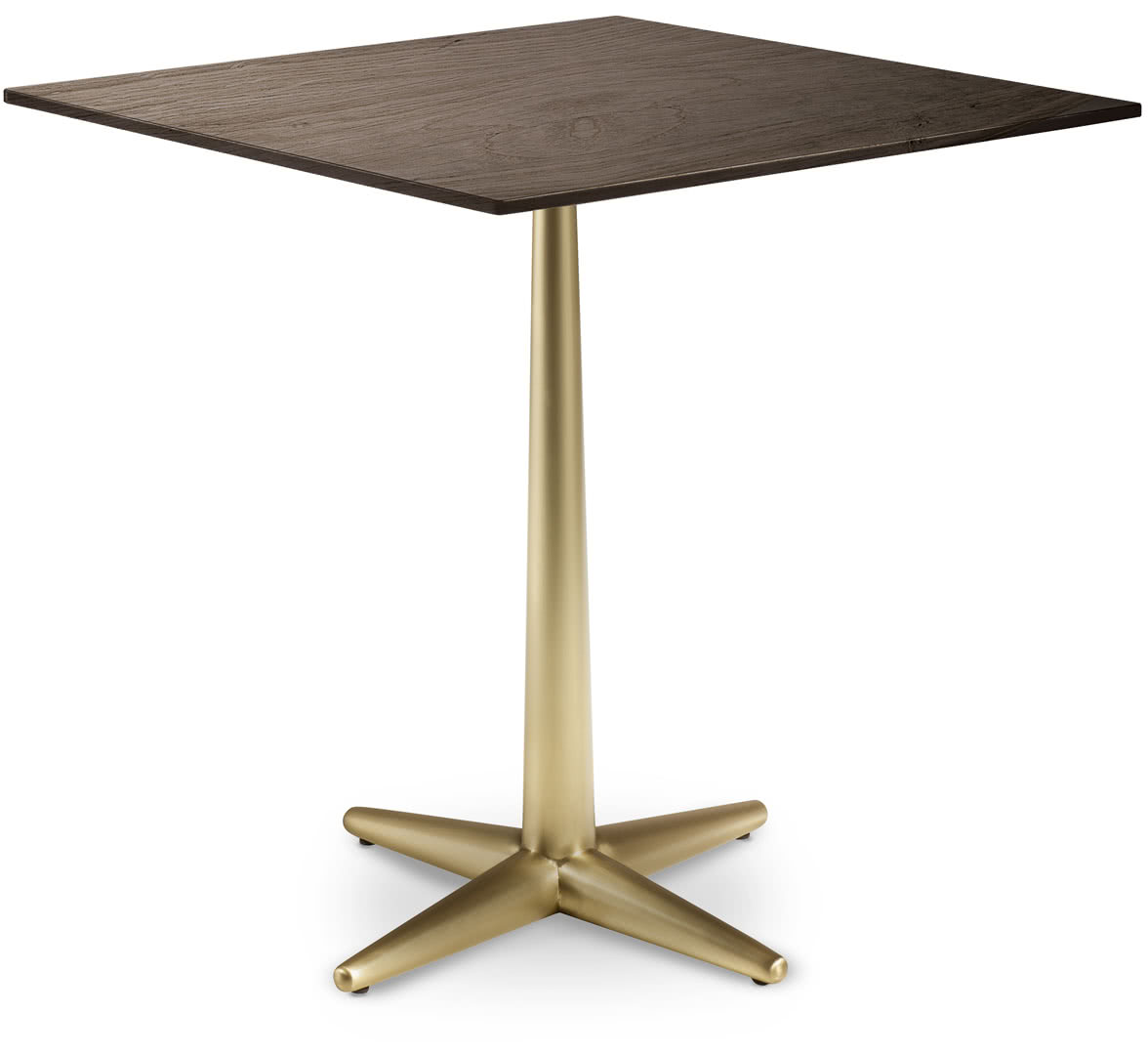 Il top in legno impiallacciato è disponibile nella versione spazzolata a poro aperto o decorata per esaltarne la sua natura vintage. Il piede è in metallo conificato a freddo, con saldatura a ottone e levigatura realizzate a mano, e finitura a bagno di galvanica (spessore minimo 25 μm).