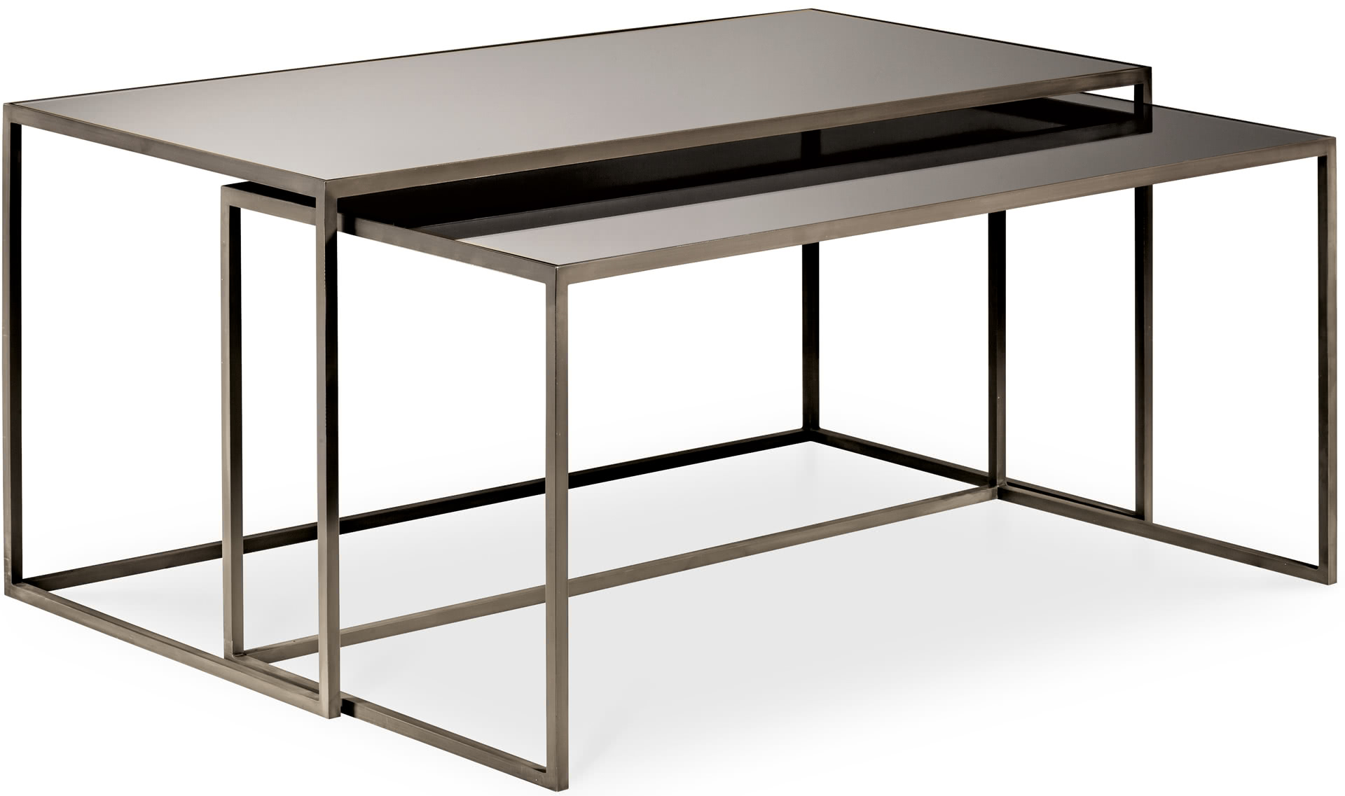 La struttura è in ferro pieno quadro con finitura a bagno di galvanica in ottone spazzolato, nichel nero o in ferro metallizzato. Il top è rivestito in specchio bronzato a filo lucido. Il set di tavolini da divano è vendibile anche singolarmente.